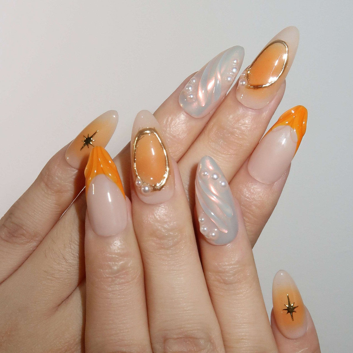 Step into a world of vibrant elegance with the Aperol Spritz Press-on Nails by MituArt. These nails feature a captivating orange aura, reminiscent of the refreshing cocktail. The 3D water wave patterns create a dynamic and fluid texture, adding depth and movement to your manicure. Gold elements and pearl accents are intricately designed, with golden stars embellishing the thumb and pinky, adding a touch of celestial charm. Perfect for those who love a mix of sophistication and playful style, Aperol Spritz nails are easy to apply and comfortable to wear, making them a stunning addition to any occasion.