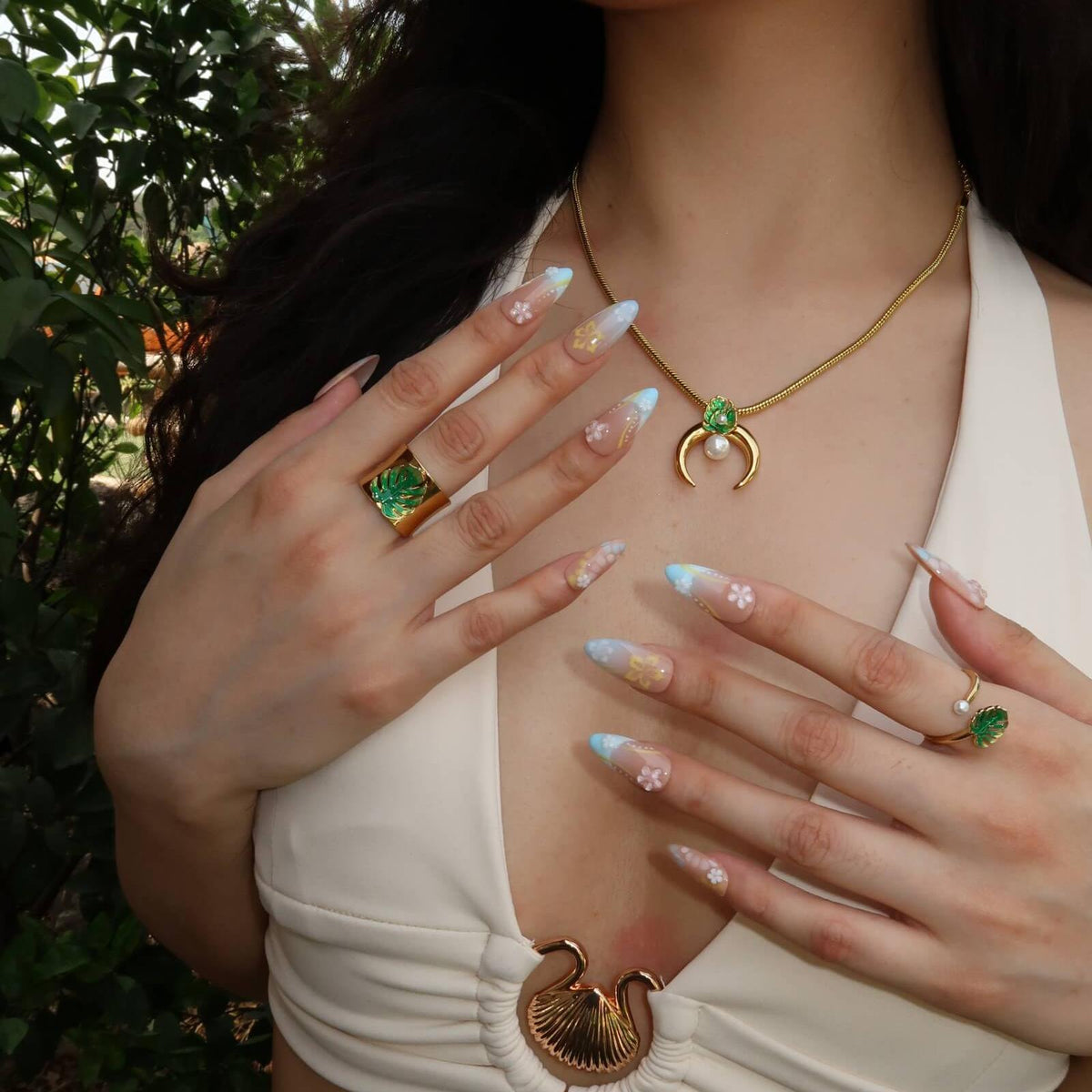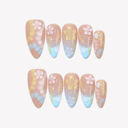 Unleash a burst of freshness with the Flowerbomb press-on nails from MituArt. Featuring a nude base with vibrant blue and yellow accents, this design blends classic French tips with a soft ombre effect. Intricate floral patterns and 3D flower embellishments add a charming touch of nature to your nails. Light, airy, and full of life, Flowerbomb is the perfect choice for a fresh and playful look that radiates a cheerful, floral-inspired vibe.