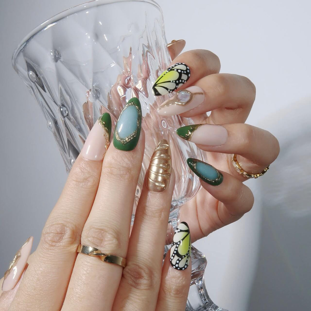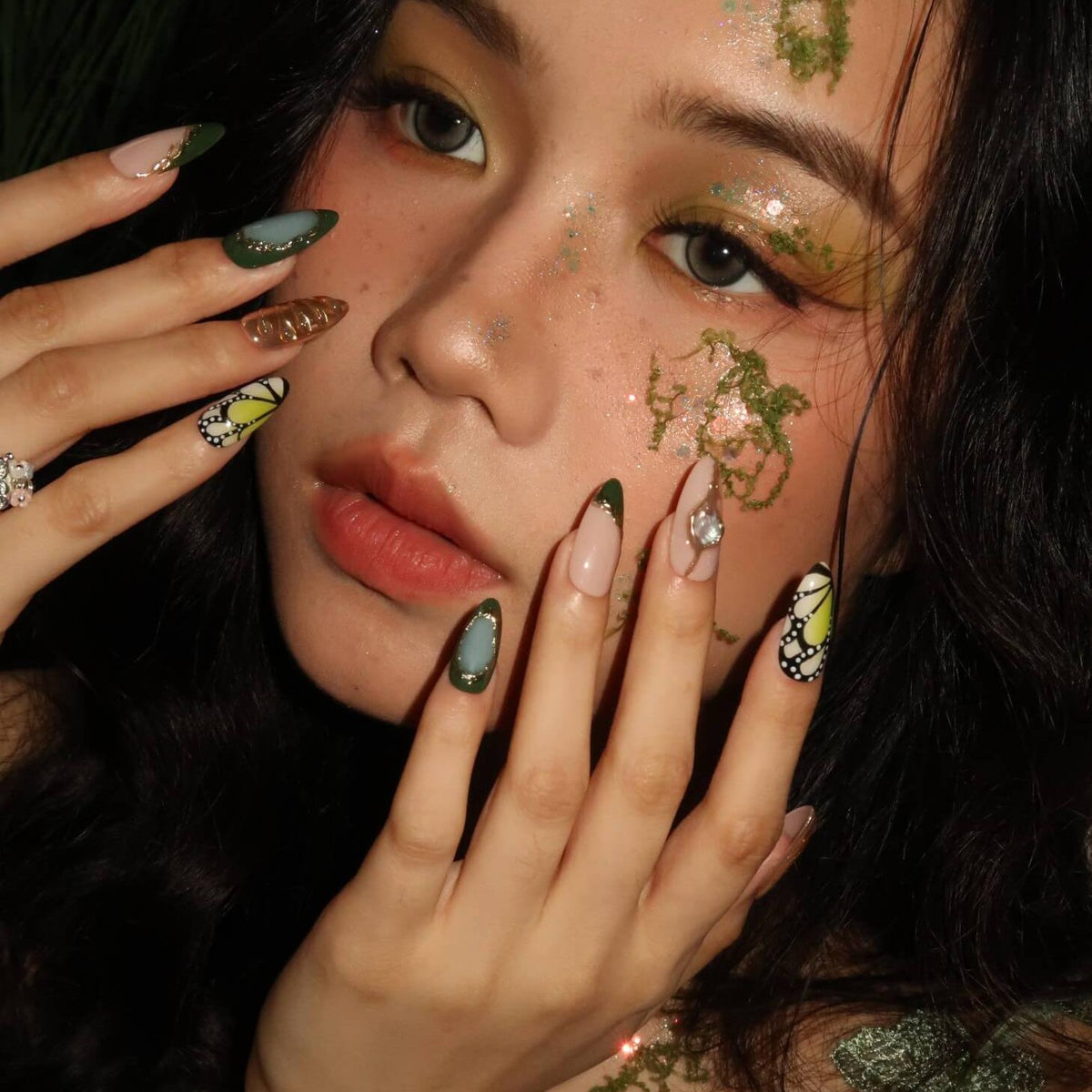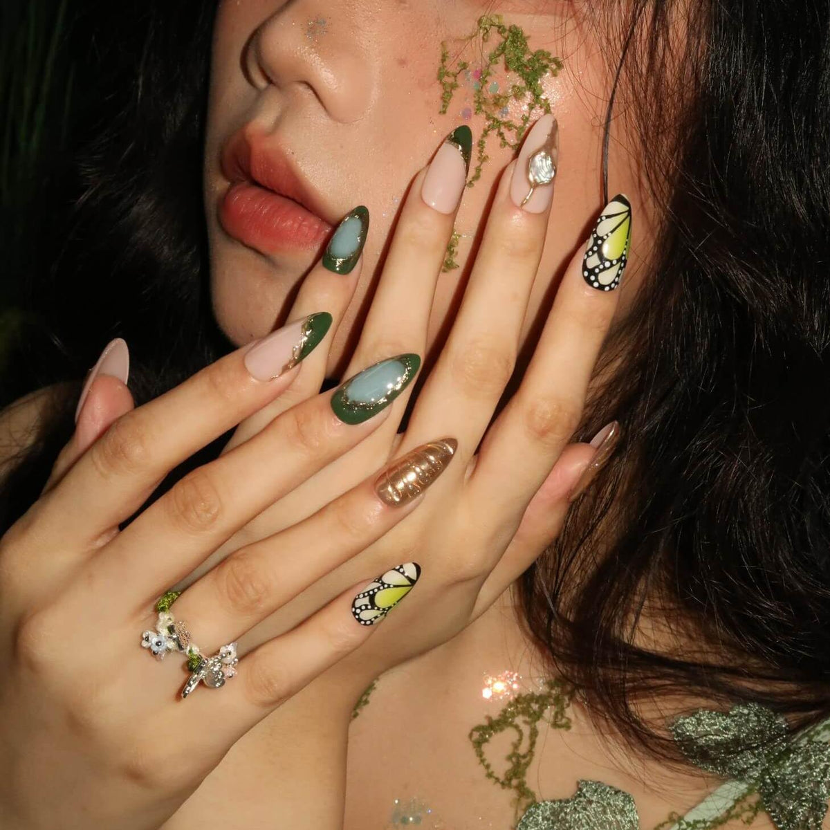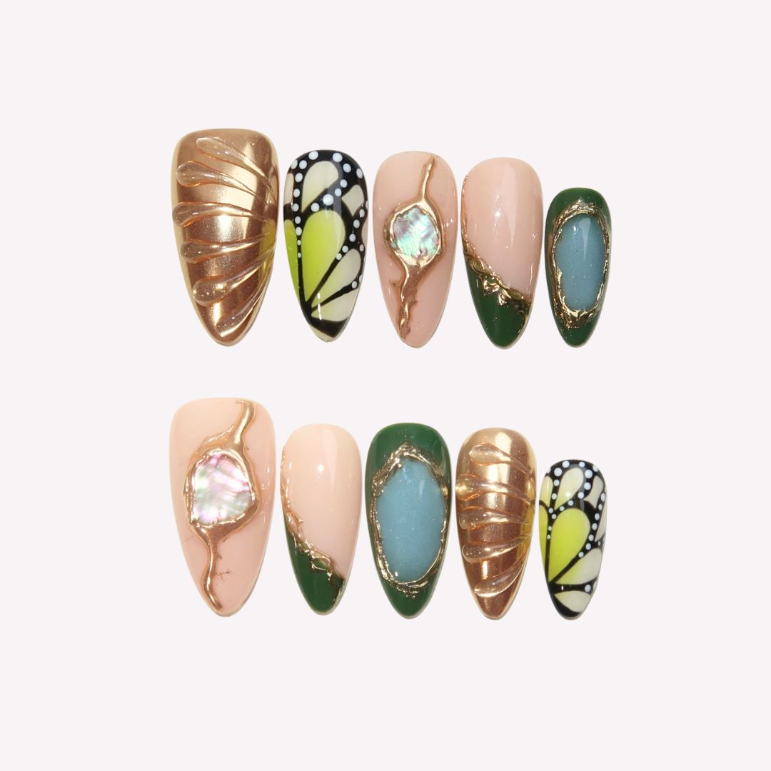 Unveil the enchanting beauty of Jardin Vert, where green and gold unite in a captivating harmony. Featuring butterfly-wing patterns on the index and pinky fingers, this design evokes the delicate elegance of nature. Irregular gold lines and a soft gradient effect add a touch of refinement, while the 3D mermaid accents bring a whimsical, magical allure. Perfect for those who seek a unique and graceful nail design that feels like a walk through a verdant garden.