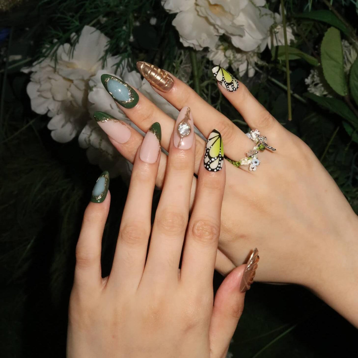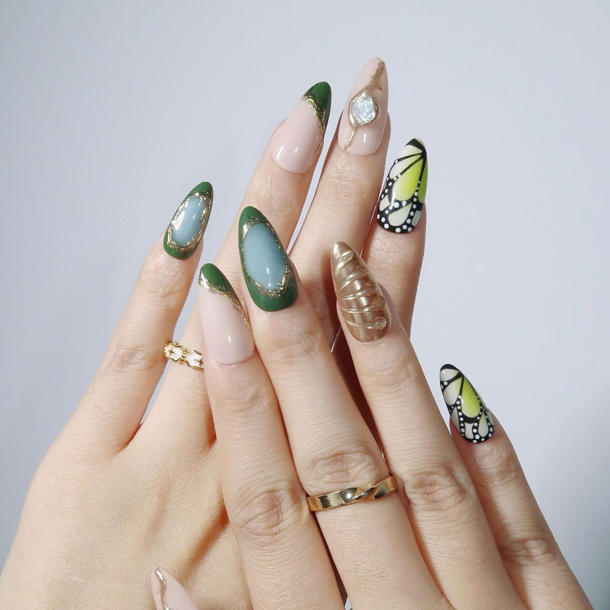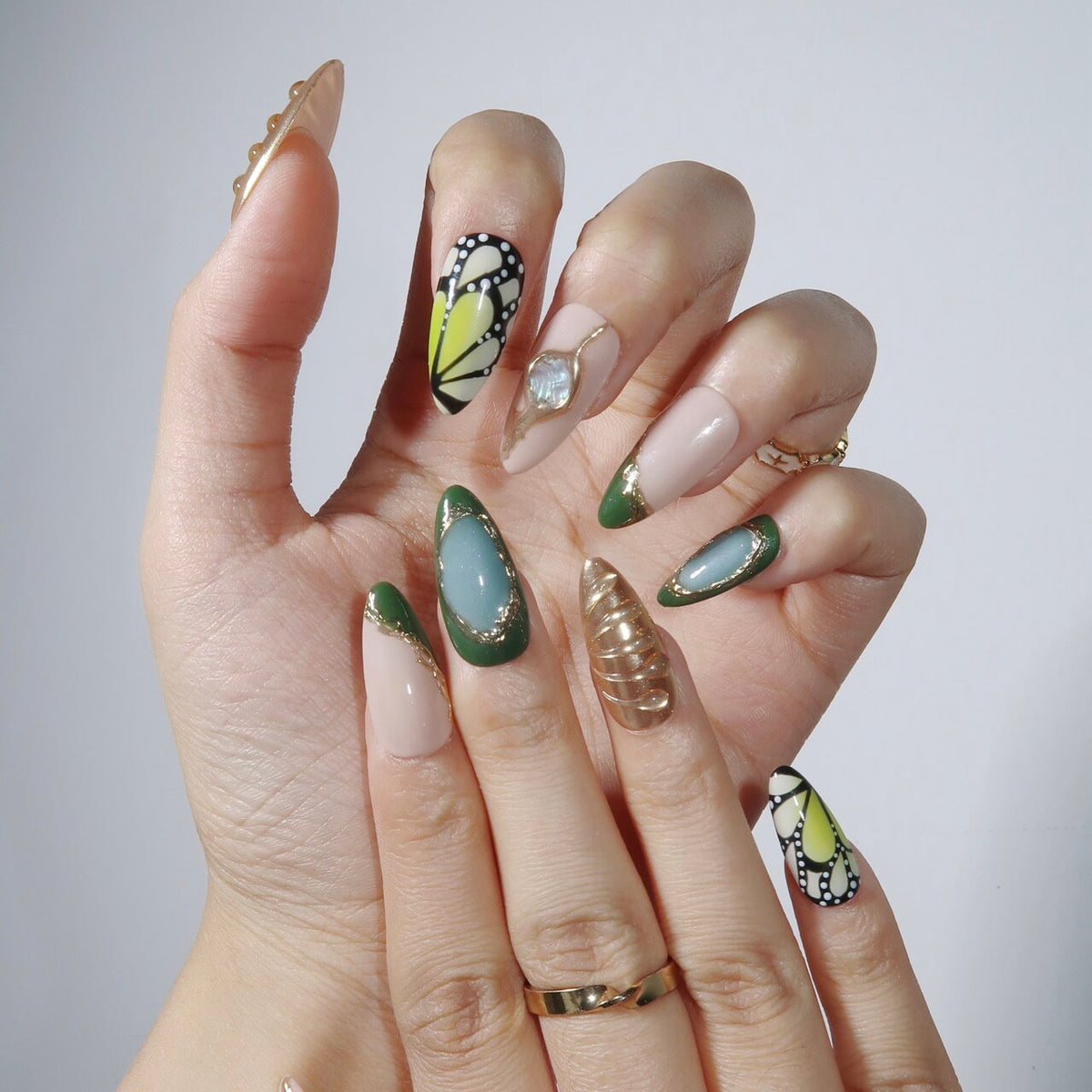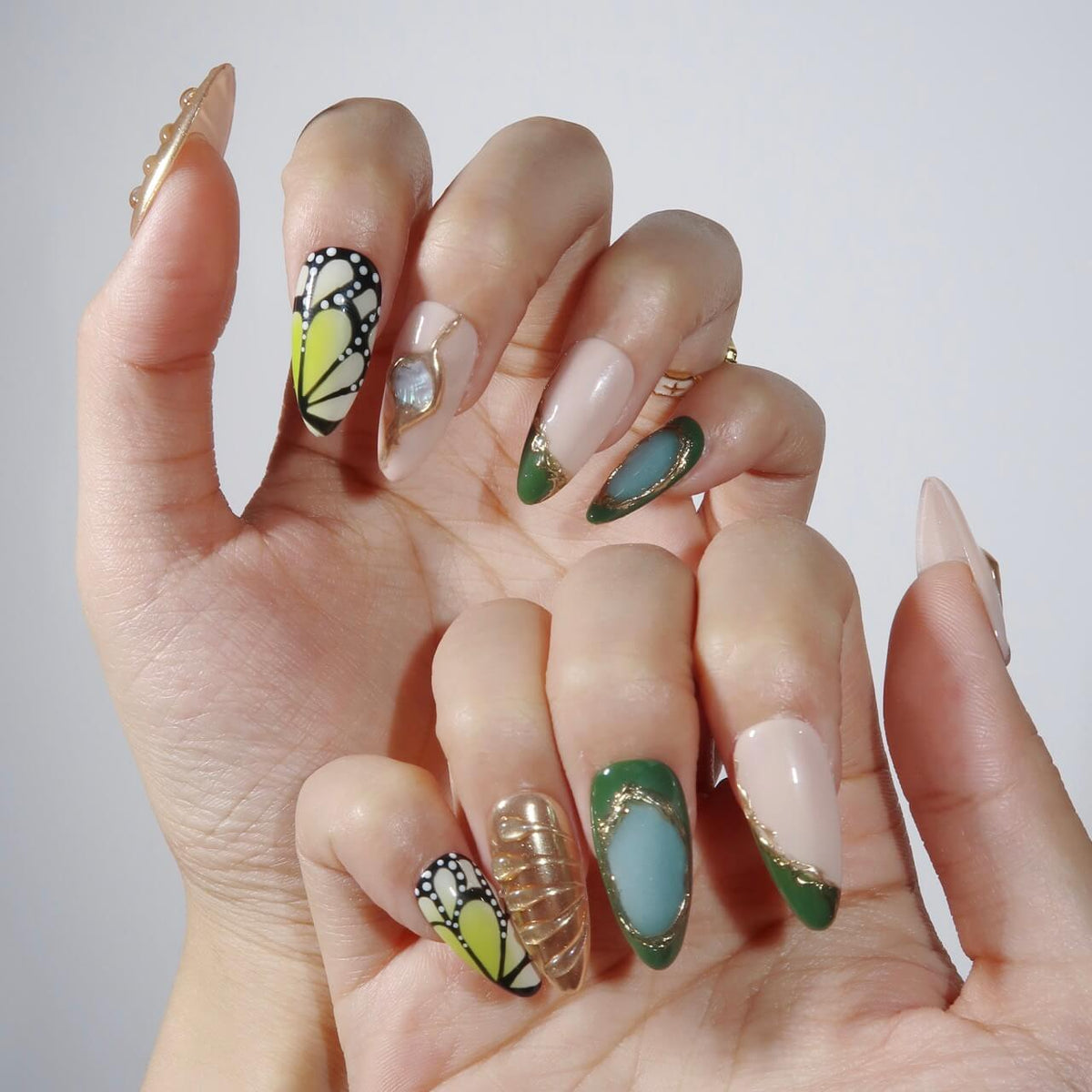 Unveil the enchanting beauty of Jardin Vert, where green and gold unite in a captivating harmony. Featuring butterfly-wing patterns on the index and pinky fingers, this design evokes the delicate elegance of nature. Irregular gold lines and a soft gradient effect add a touch of refinement, while the 3D mermaid accents bring a whimsical, magical allure. Perfect for those who seek a unique and graceful nail design that feels like a walk through a verdant garden.