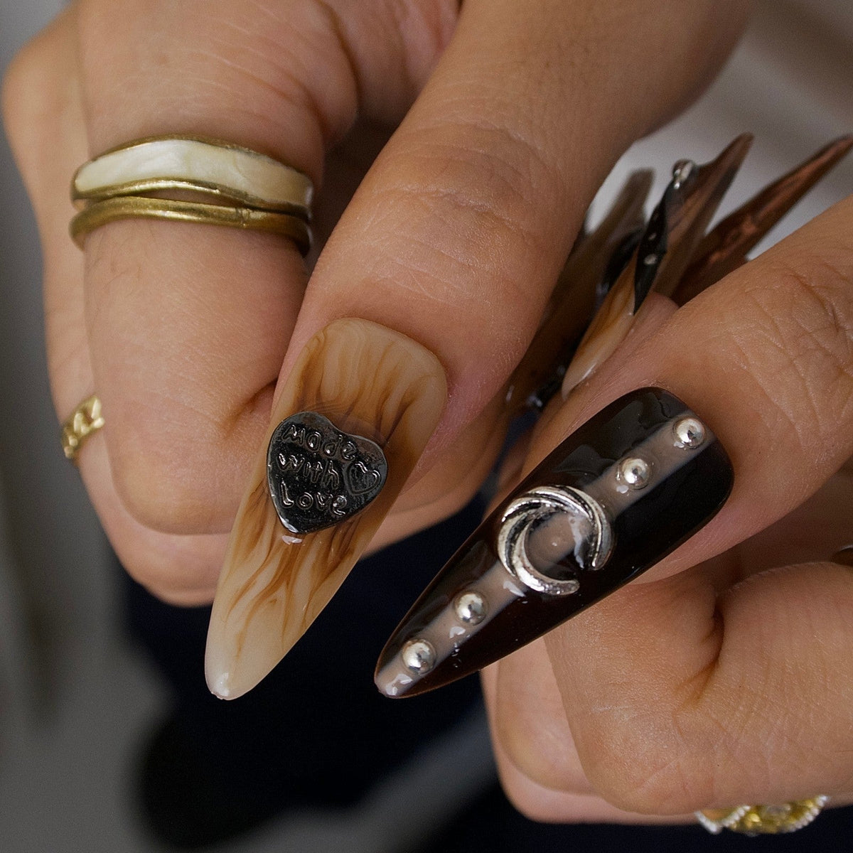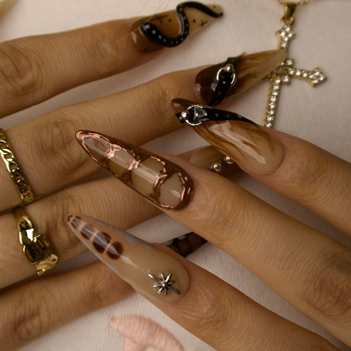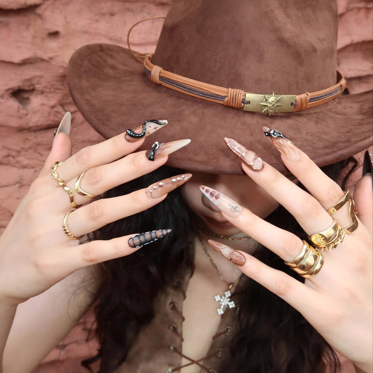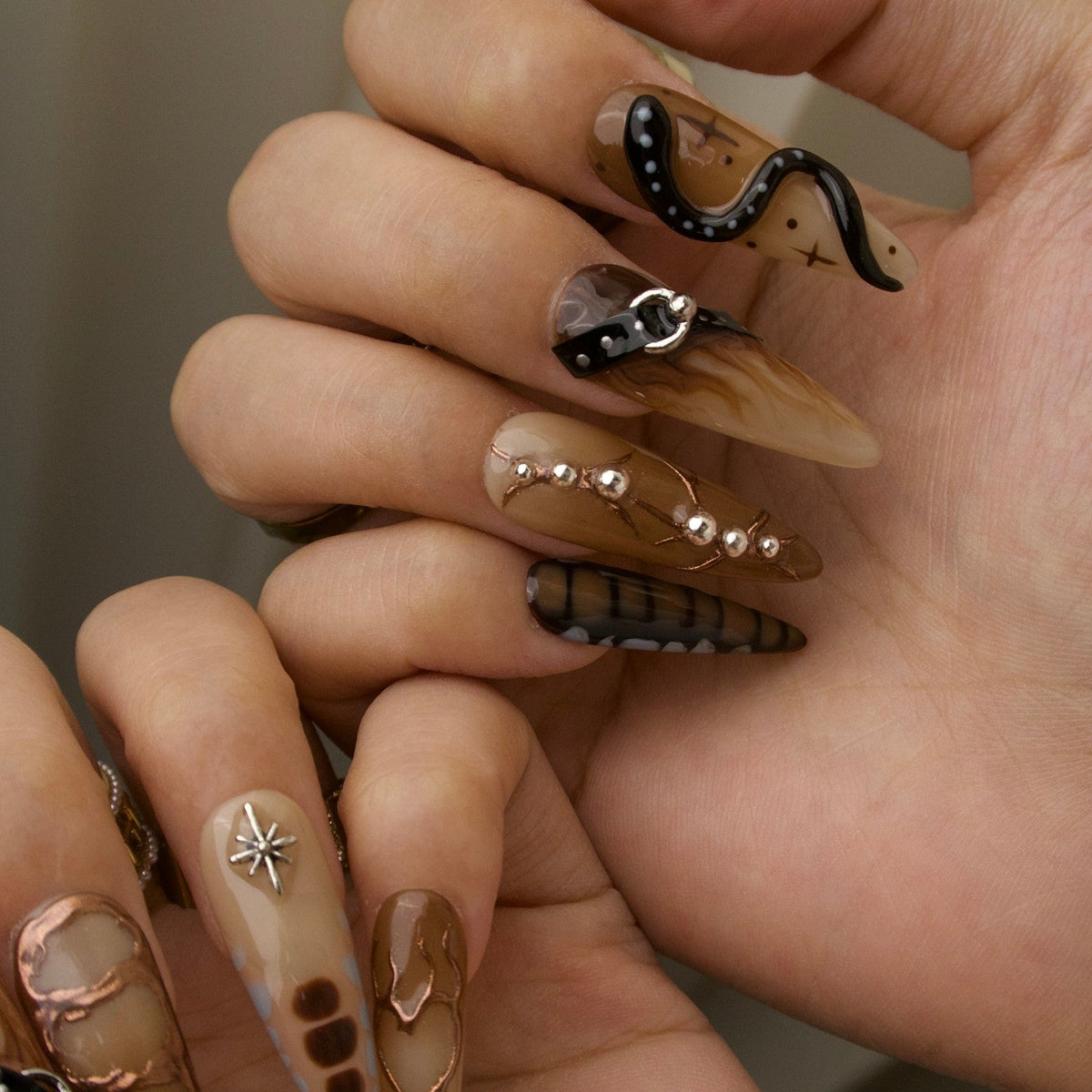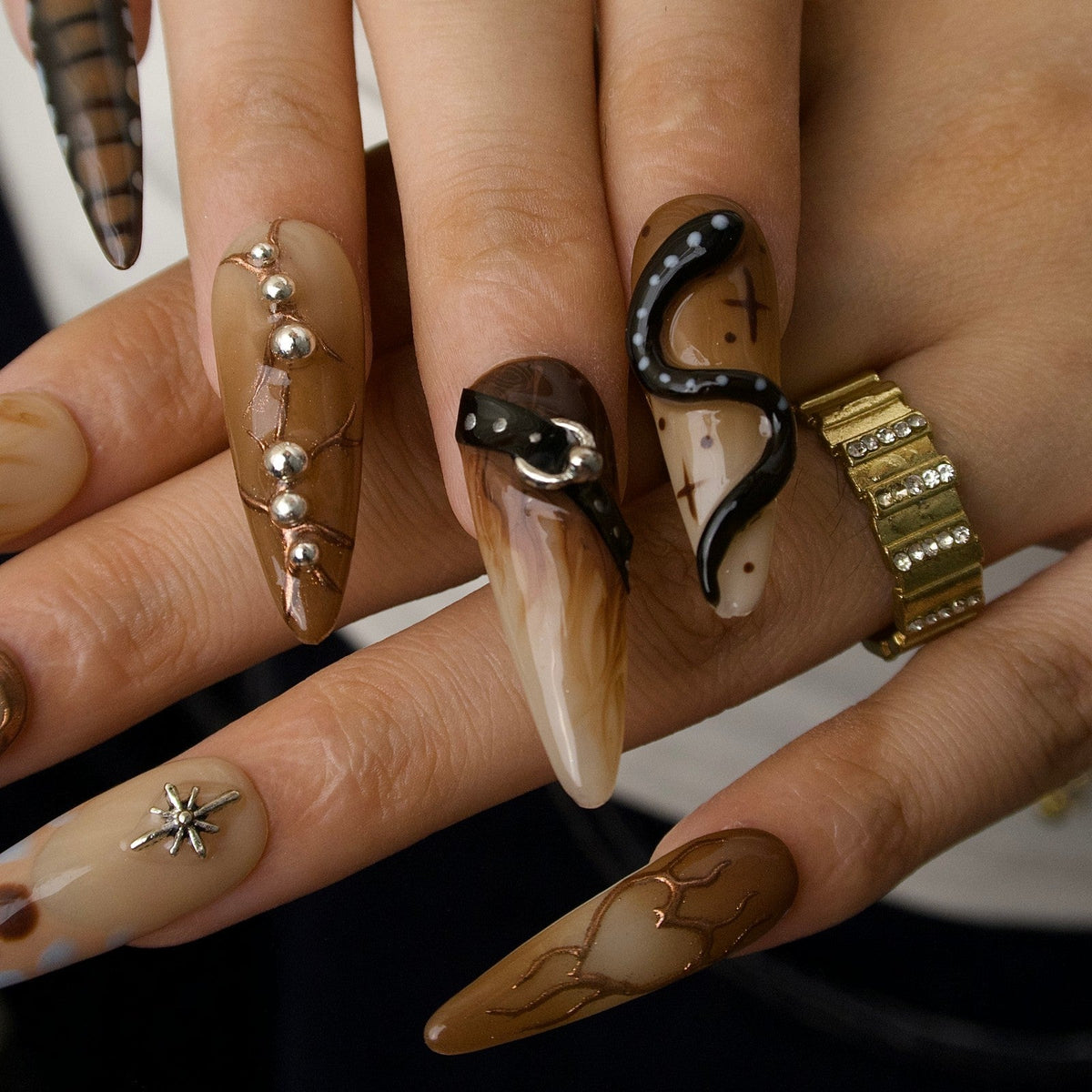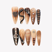 Unleash your untamed side with Wild Heart from MituArt. These bold press-on nails feature rich brown tones, accented with metallic chrome tips, a 3D snake embellishment, and silver charms shaped like moons, hearts, and stars. Finished with edgy faux belt details, this set captures fierce festival vibes and desert glam in one daring look.