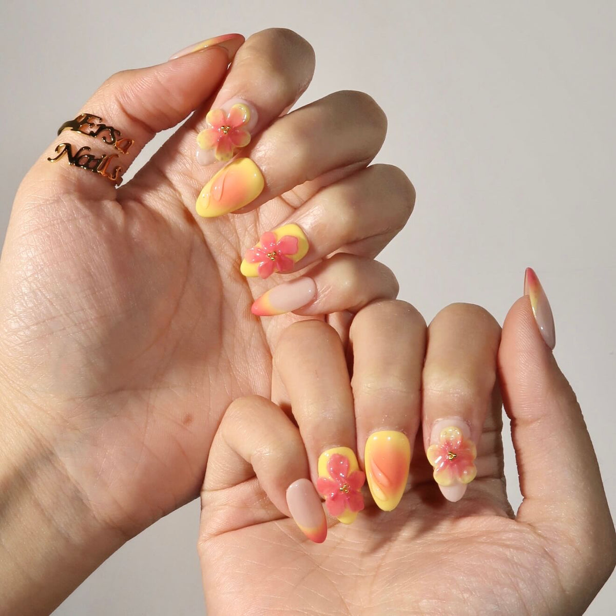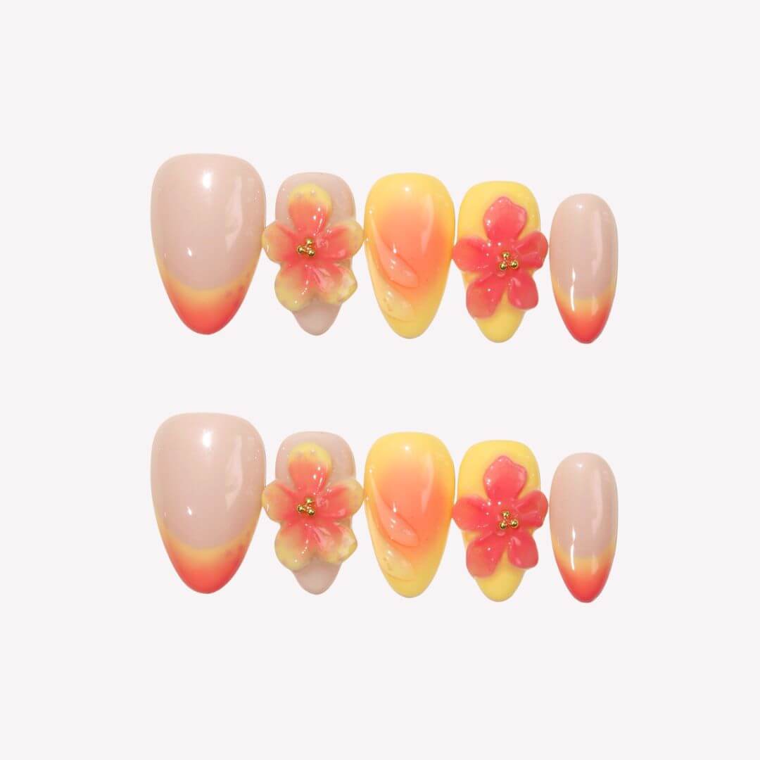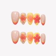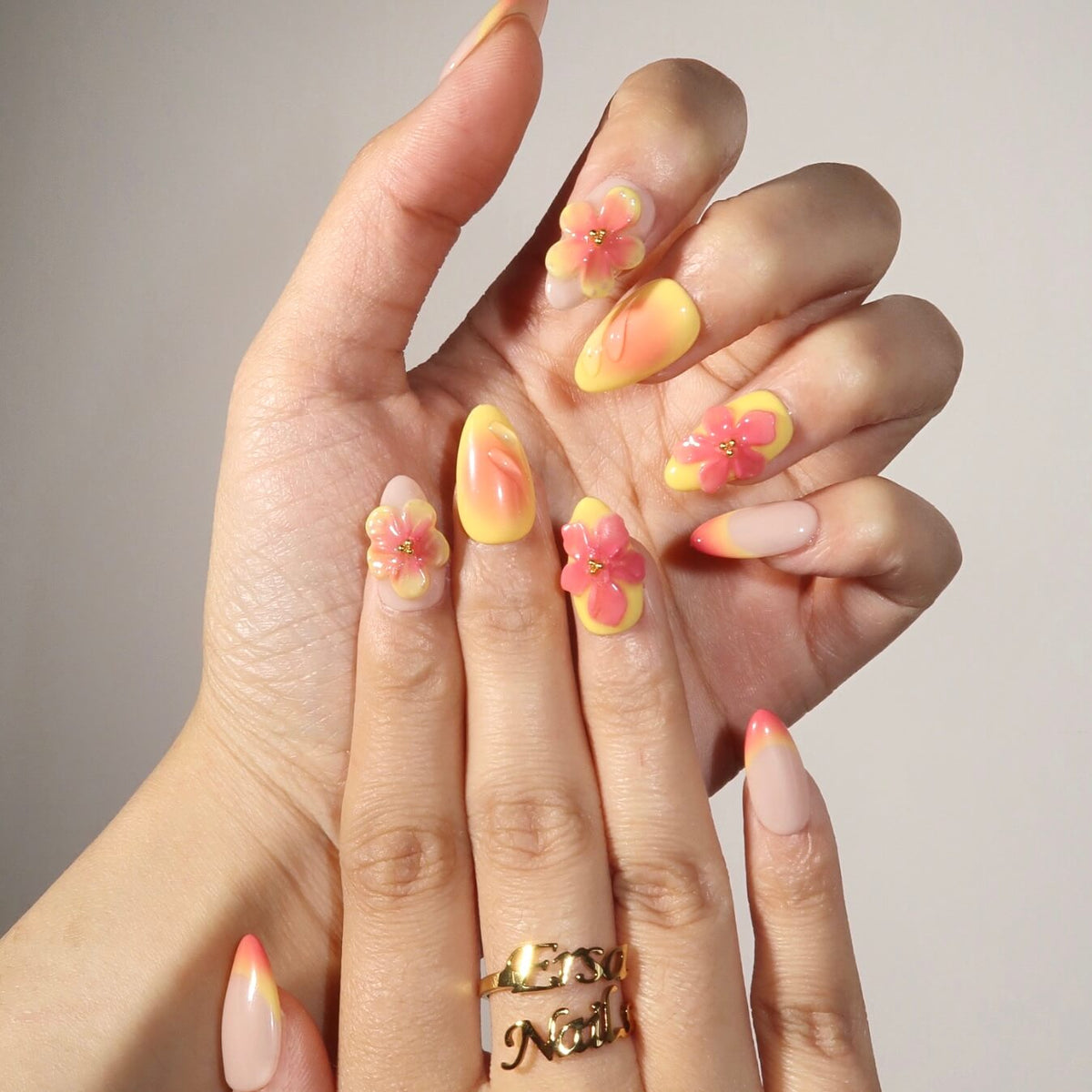 Embrace the warmth of summer with the Sundazed press-on nails from MituArt. Featuring a vibrant blend of yellow, orange, and pink tones, this set combines French tips, a stunning ombre design, and a soft aura effect for a fresh, lively look. 3D floral embellishments add a touch of charm, completing the vibrant, sun-kissed aesthetic. Perfect for anyone looking to add a pop of color and a burst of energy to their nails, Sundazed is all about capturing that carefree, sun-drenched vibe.