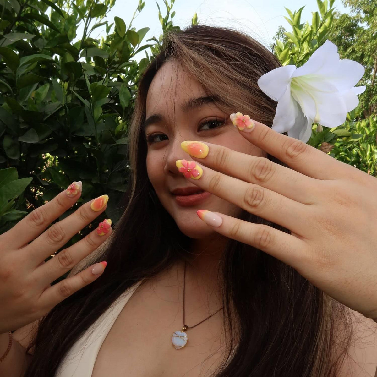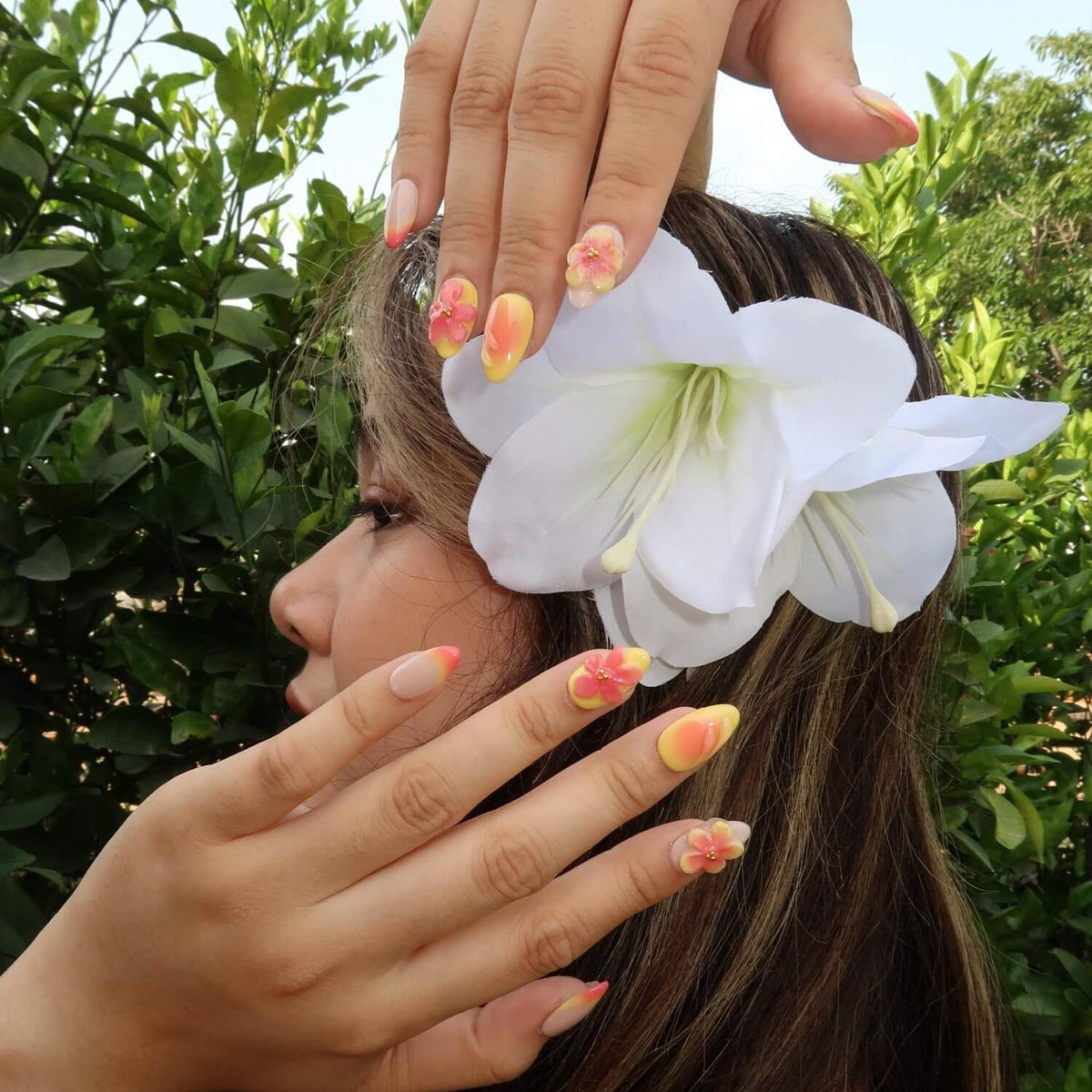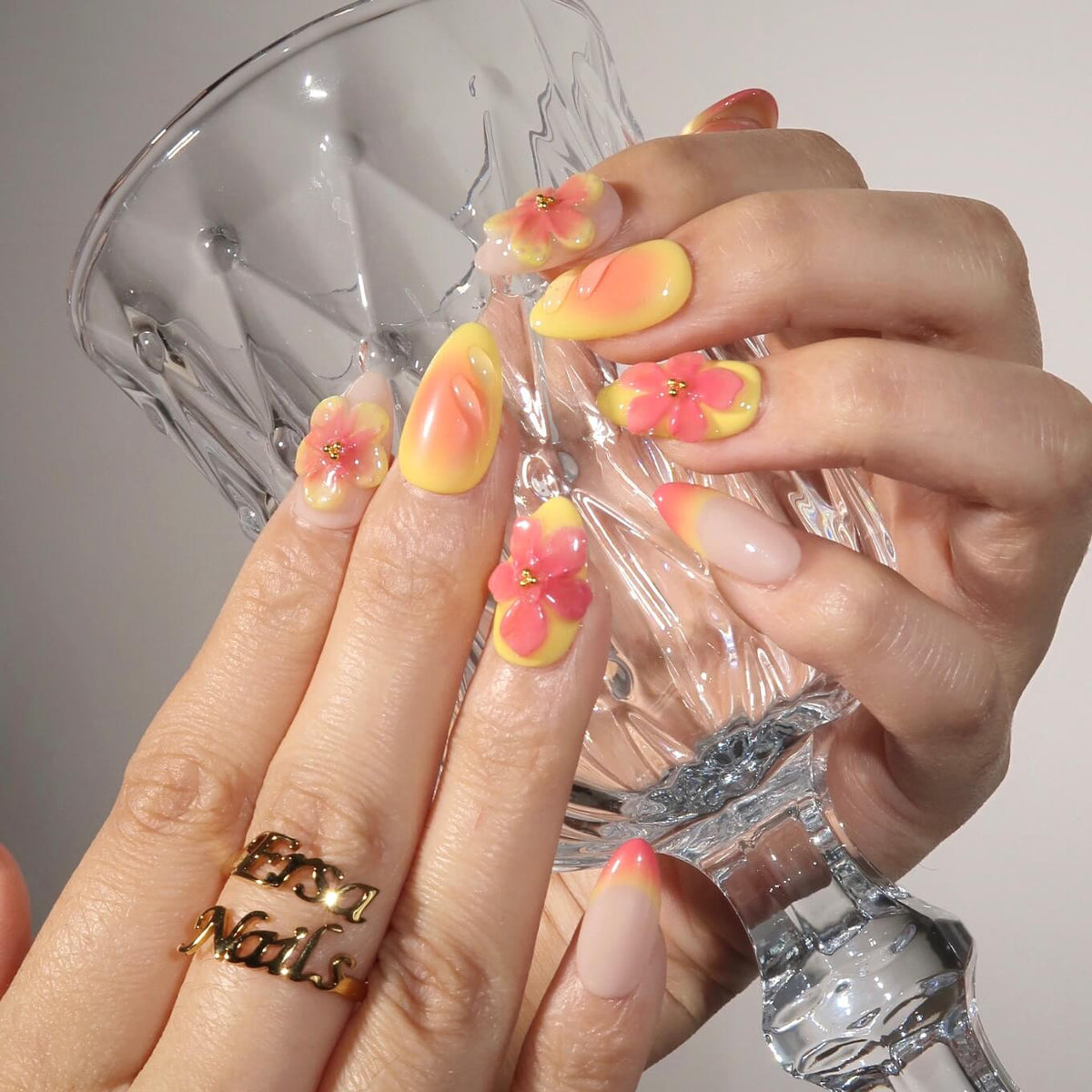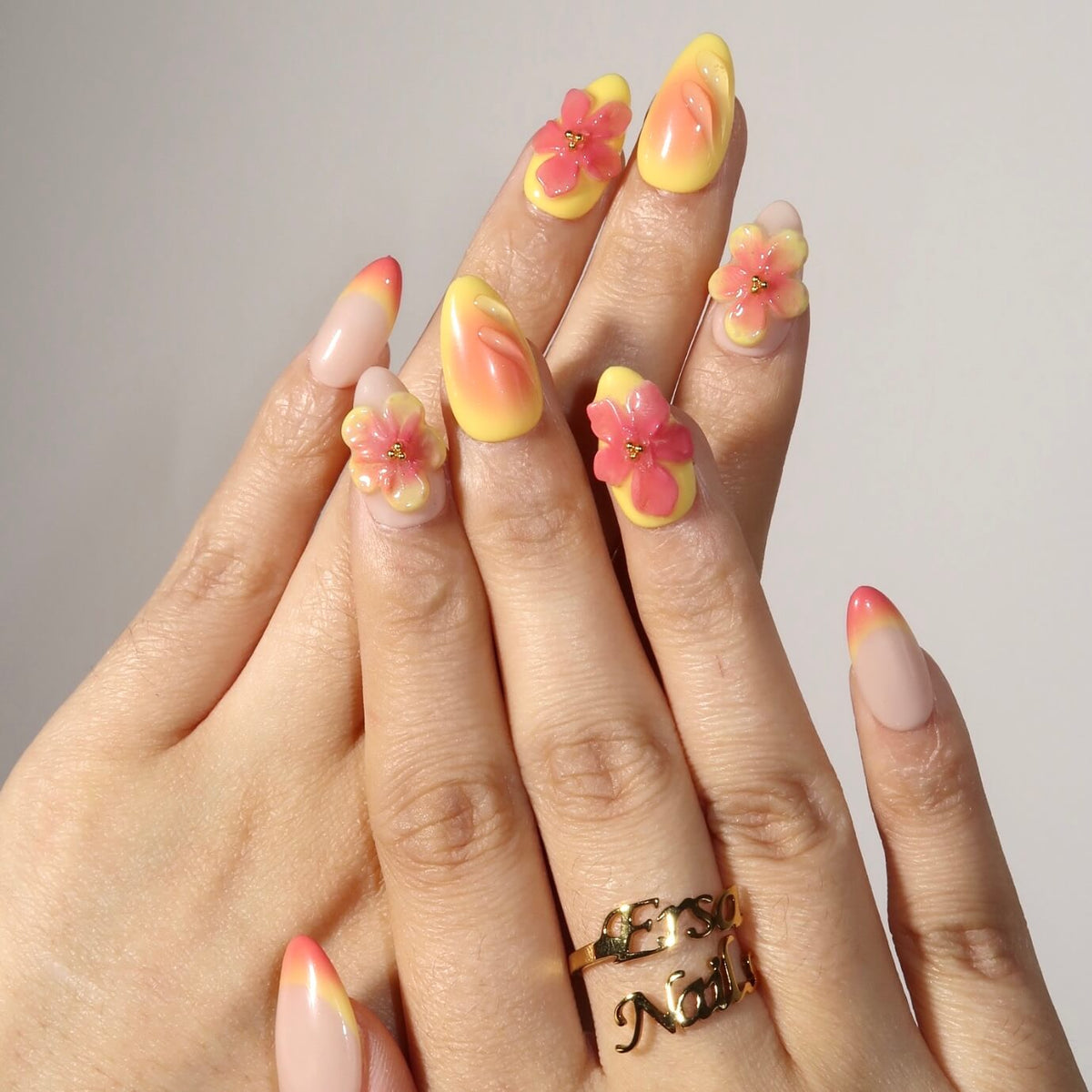 Embrace the warmth of summer with the Sundazed press-on nails from MituArt. Featuring a vibrant blend of yellow, orange, and pink tones, this set combines French tips, a stunning ombre design, and a soft aura effect for a fresh, lively look. 3D floral embellishments add a touch of charm, completing the vibrant, sun-kissed aesthetic. Perfect for anyone looking to add a pop of color and a burst of energy to their nails, Sundazed is all about capturing that carefree, sun-drenched vibe.
