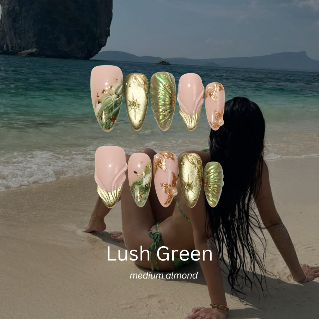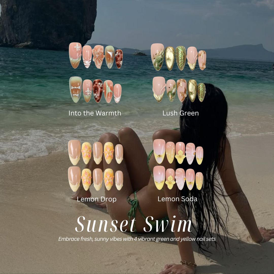 Bask in the warmth of summer with the Sunset Swim press-on nails bundle from MituArt. This vibrant set features refreshing shades of green and yellow, capturing the essence of a sun-kissed summer day. With a lively, fresh aesthetic, Sunset Swim is the perfect way to add a touch of sunshine to your nails. Whether you're lounging by the pool or soaking up the summer vibes, this bundle brings a burst of warmth and nature-inspired beauty to your look.