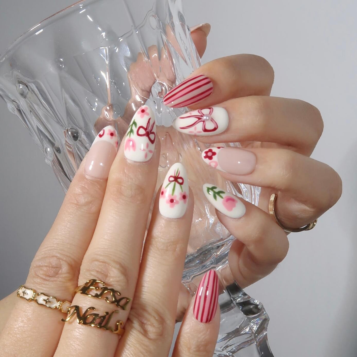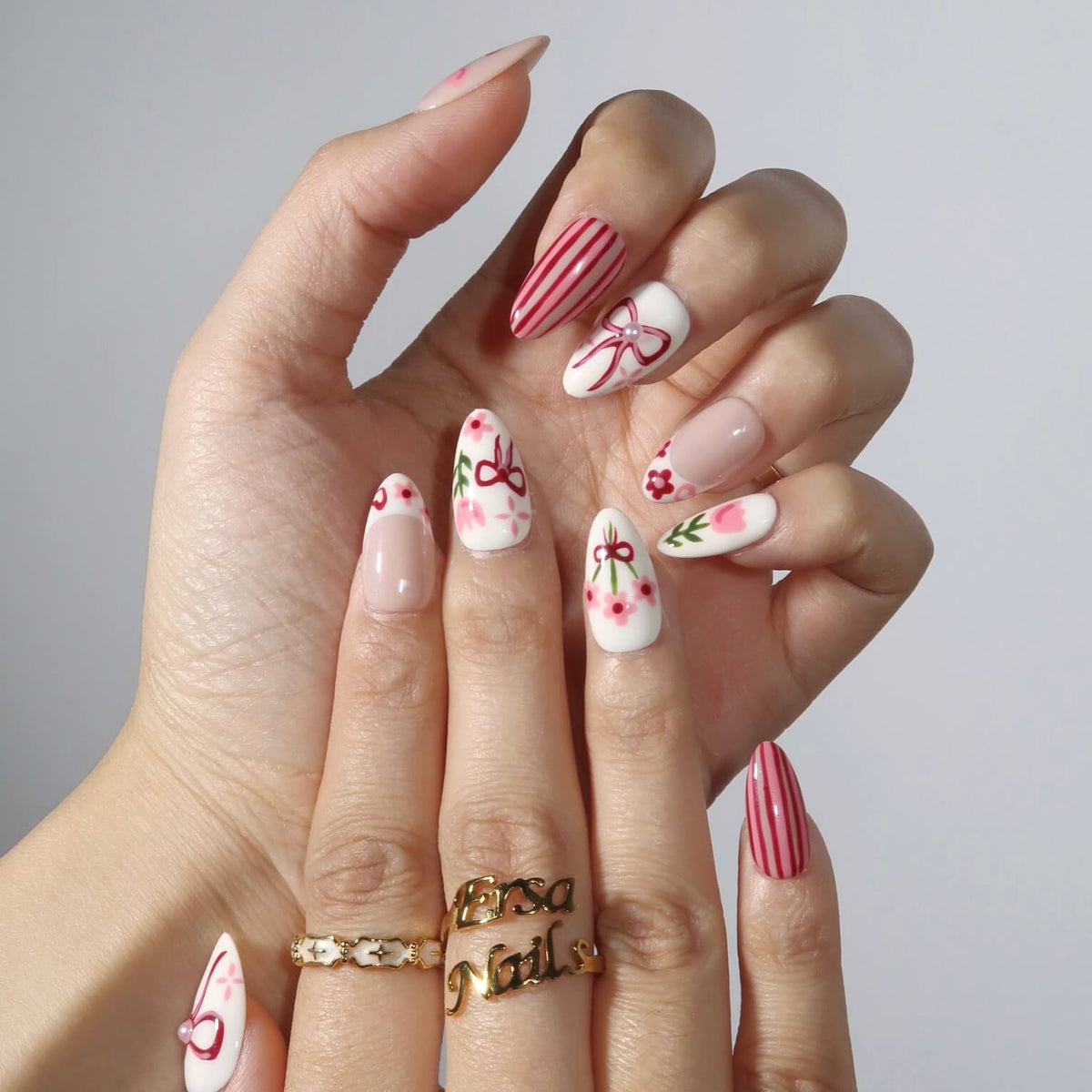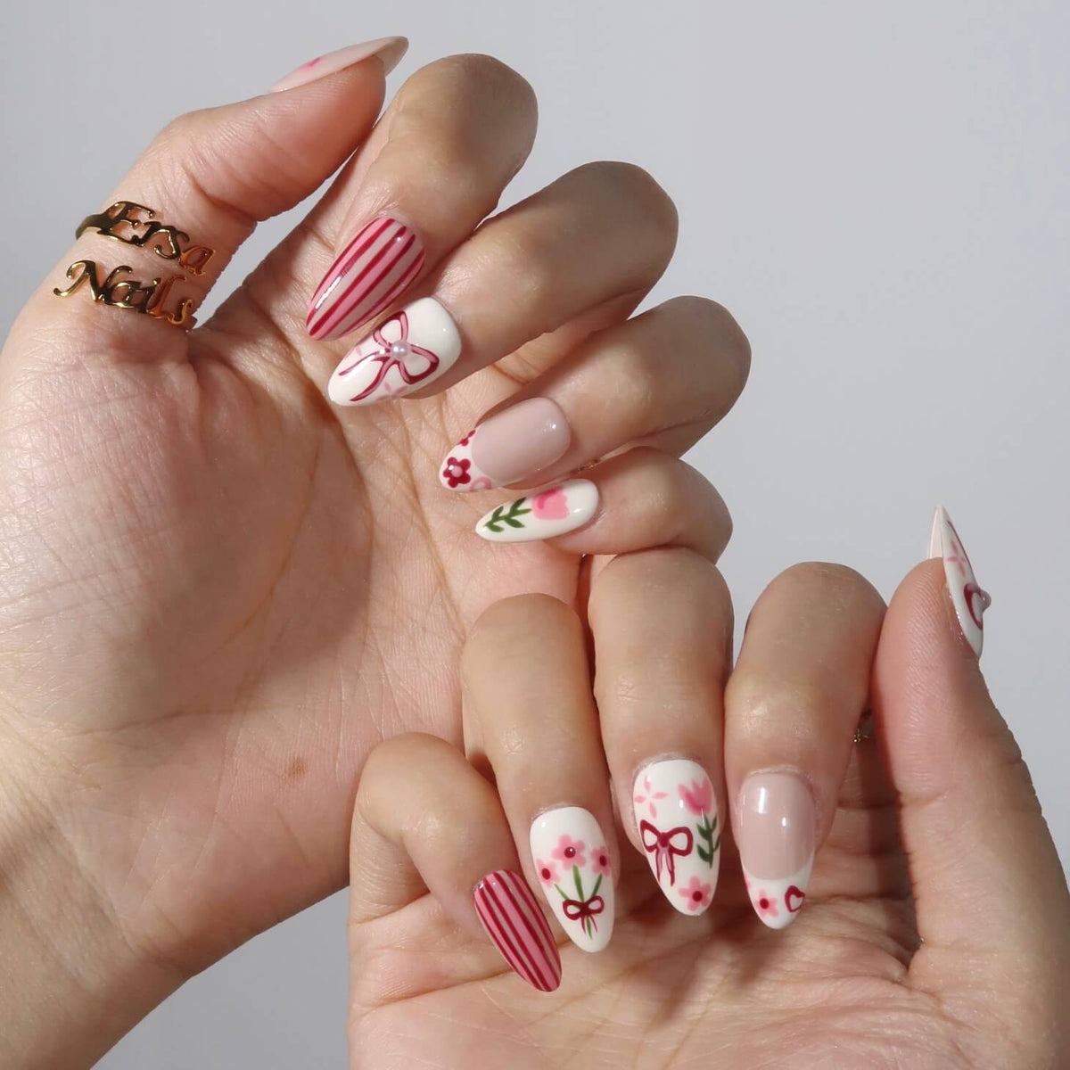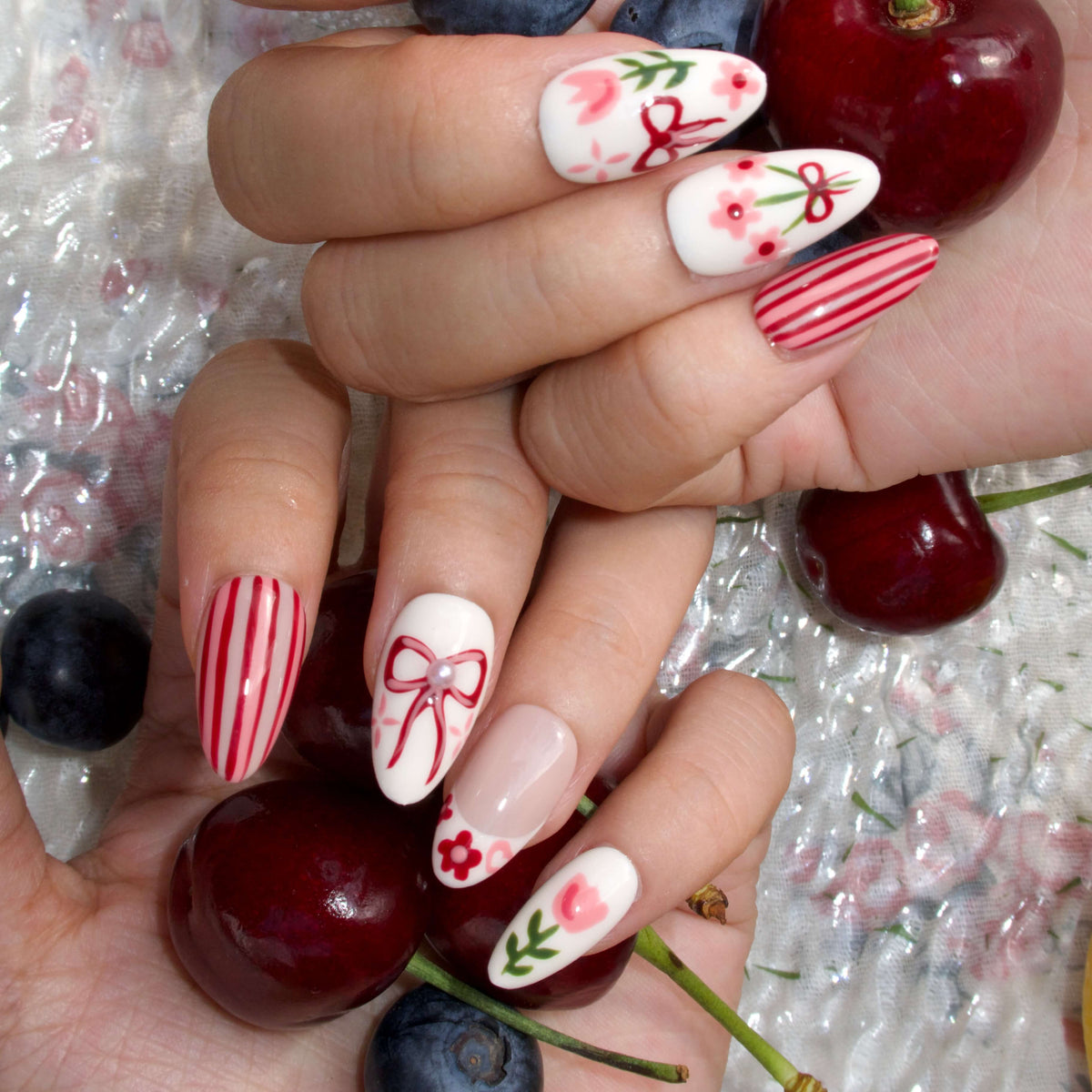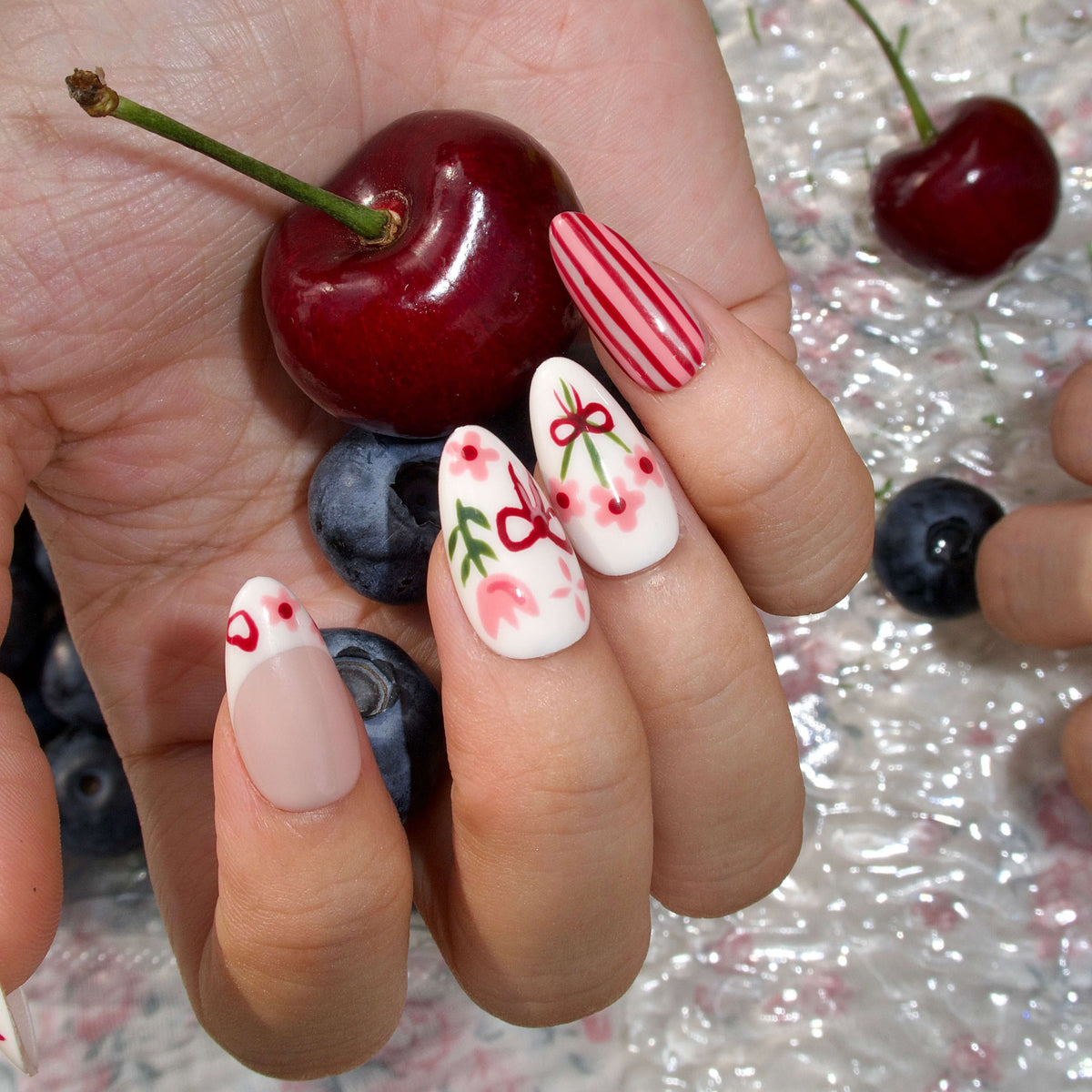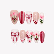 Celebrate the beauty of spring with Tulip Harvest from MituArt. This charming set features a soft blend of white and pink tones, adorned with delicate tulip and flower patterns, playful bow designs, and elegant striped details. Finished off with pearl accents, these nails offer a perfect balance of sweetness and sophistication, making them the ideal choice for any springtime look.