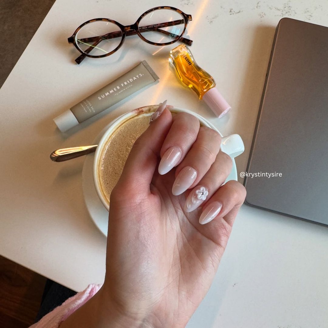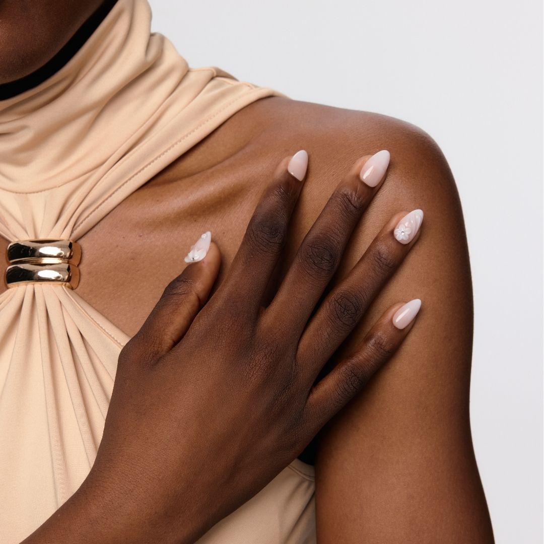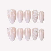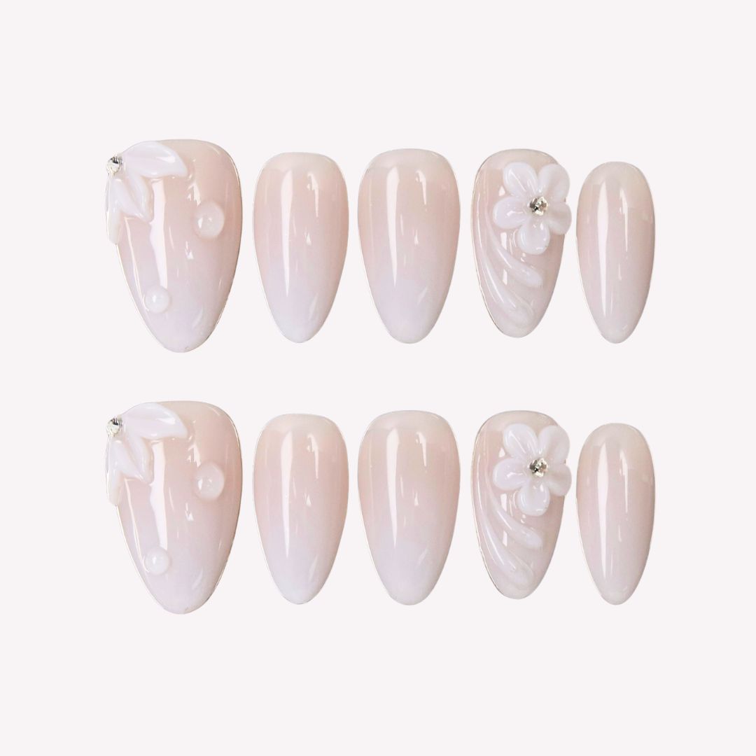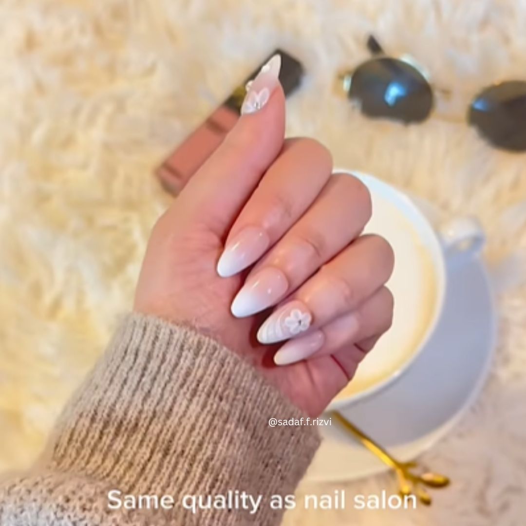 Elevate your elegance with Venus Press-on Nails by MituArt. This exquisite design features a soft nude base color, transitioning seamlessly into a graceful white gradient. Delicate white floral accents add a touch of romance, embodying the essence of gentle sophistication. Perfect for those who love a subtle yet refined look, Venus nails bring a timeless and elegant beauty to your fingertips, making them the ideal choice for any occasion that calls for understated charm.