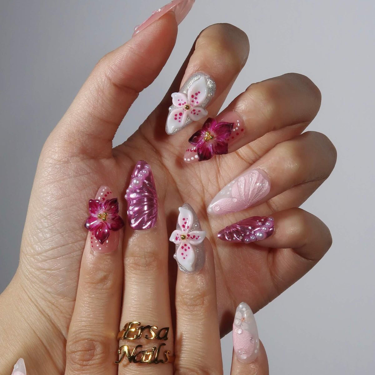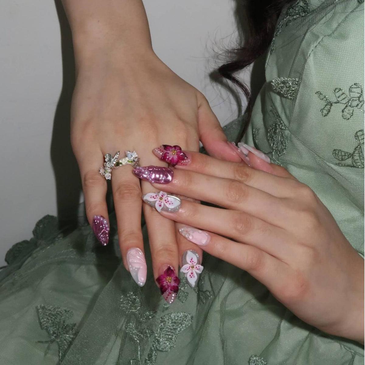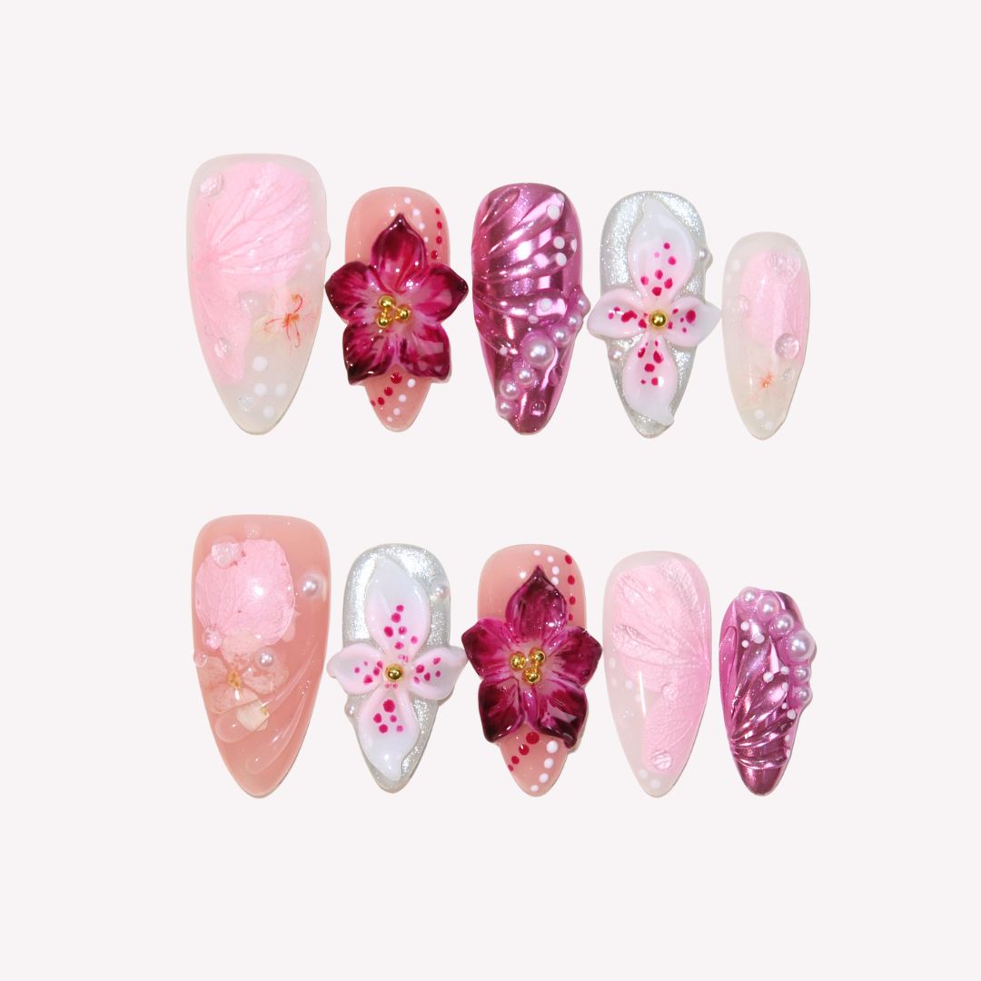 Wildest Dreams from MituArt is a breathtaking press-on nails set that exudes elegance and whimsy. Featuring a soft blend of pink and lavender tones, this set is beautifully adorned with intricate floral designs, including 3D flowers that create a stunning, textured effect. Pearl and crystal accents add a touch of glamour, while delicate detailing gives it a dreamlike, ethereal quality. Perfect for those who want to embrace femininity and sophistication, Wildest Dreams brings a romantic and luxurious vibe to your nails, making it an ideal choice for any special occasion.