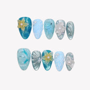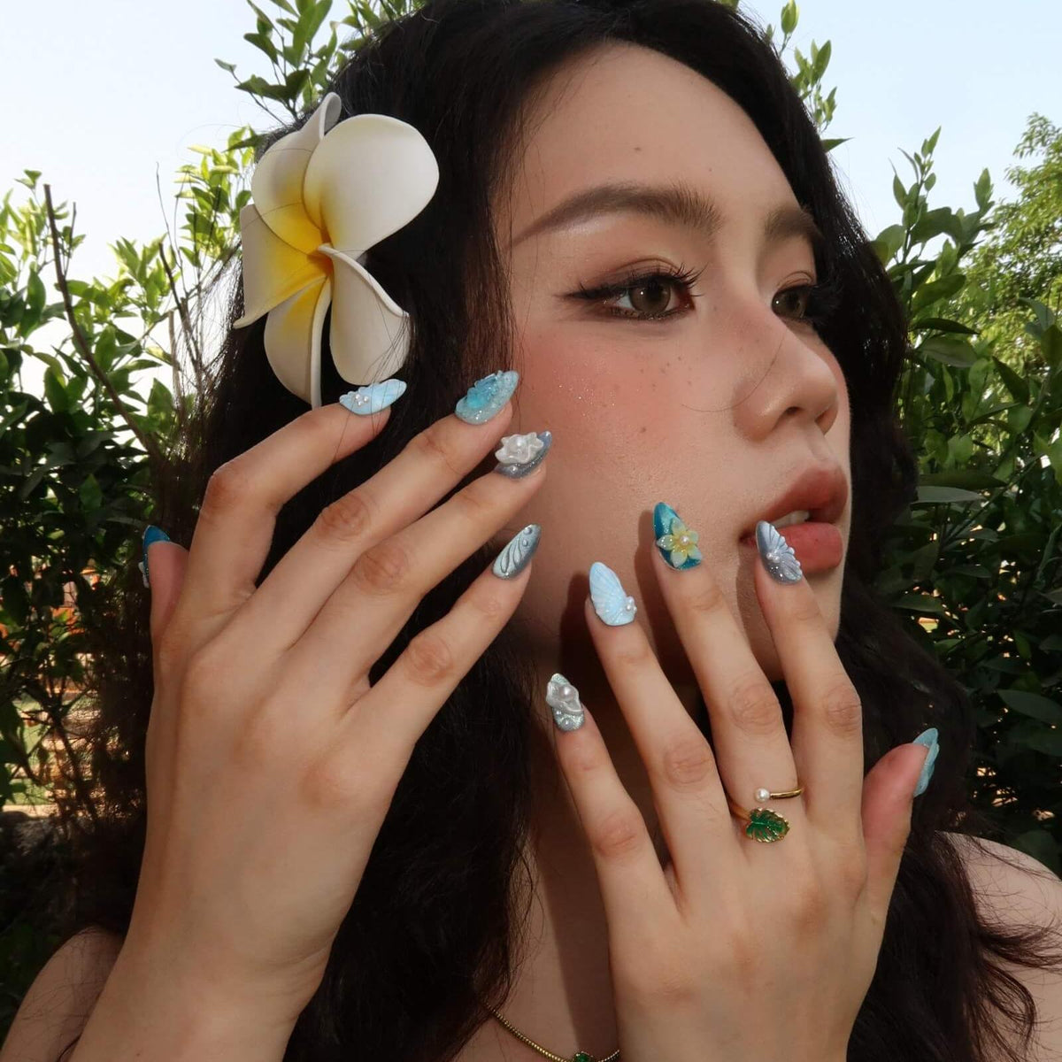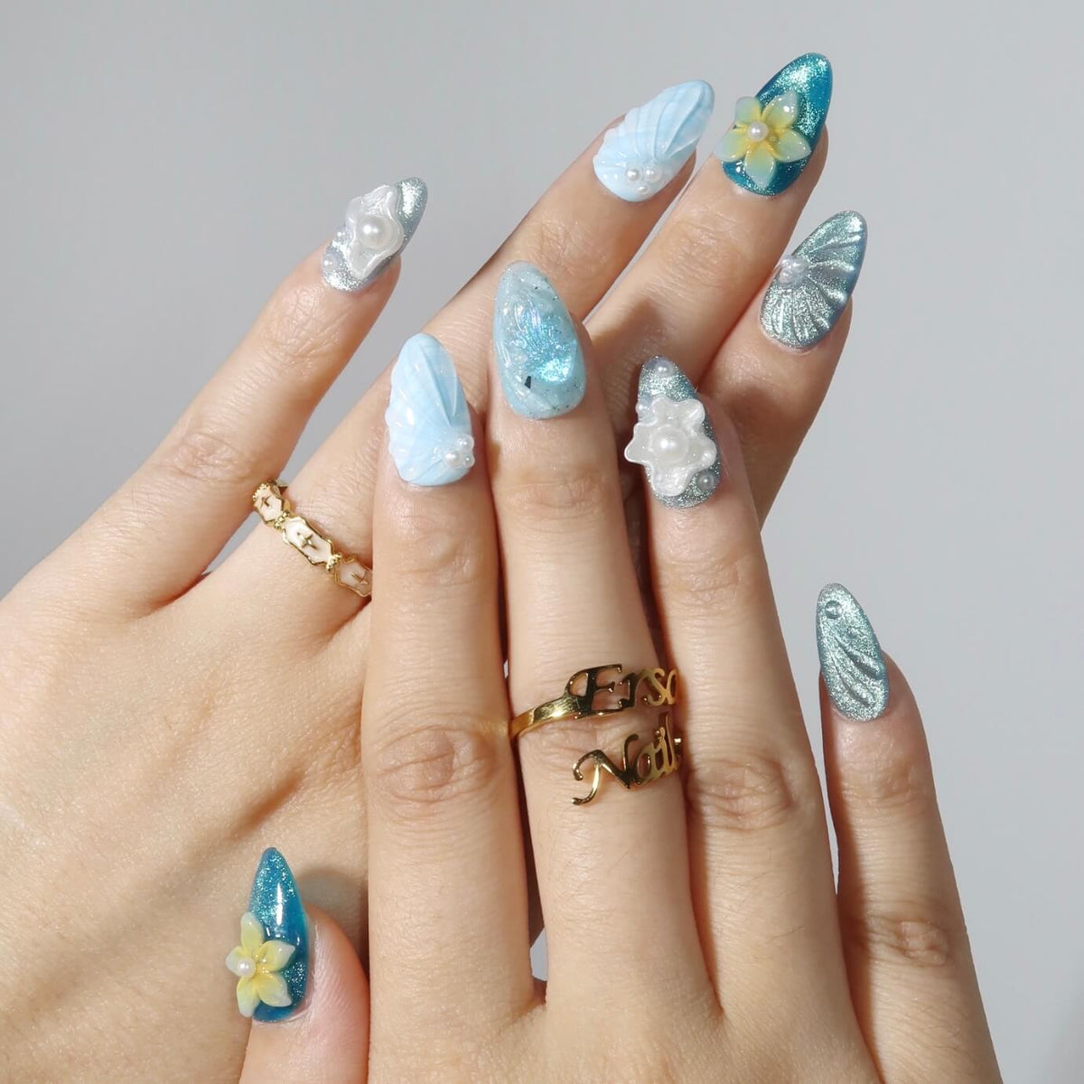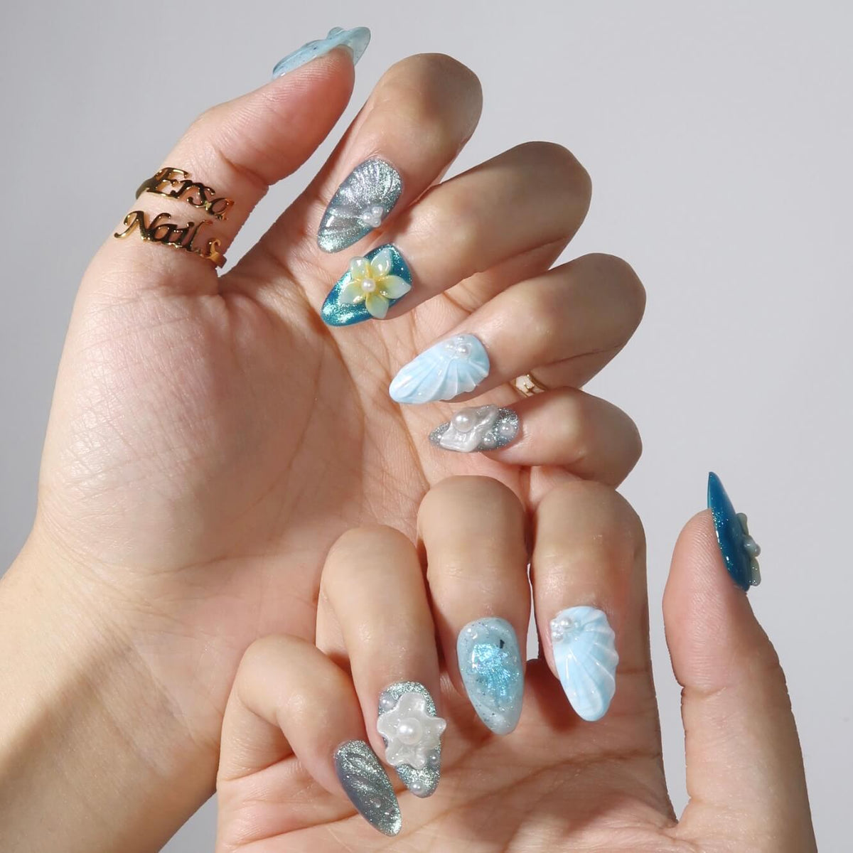 Dive into style with Bubbly Splash press-on nails from MituArt. Featuring a stunning blue cat-eye effect and sparkling glitter accents, these nails are completed with 3D pale yellow flowers and pearl details for a sophisticated touch. The 3D mermaid design adds a playful and whimsical feel, perfect for any occasion. Easy to apply and long-lasting, these nails are sure to make a statement.