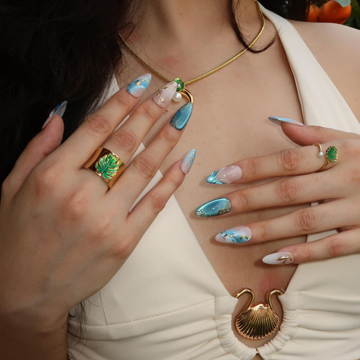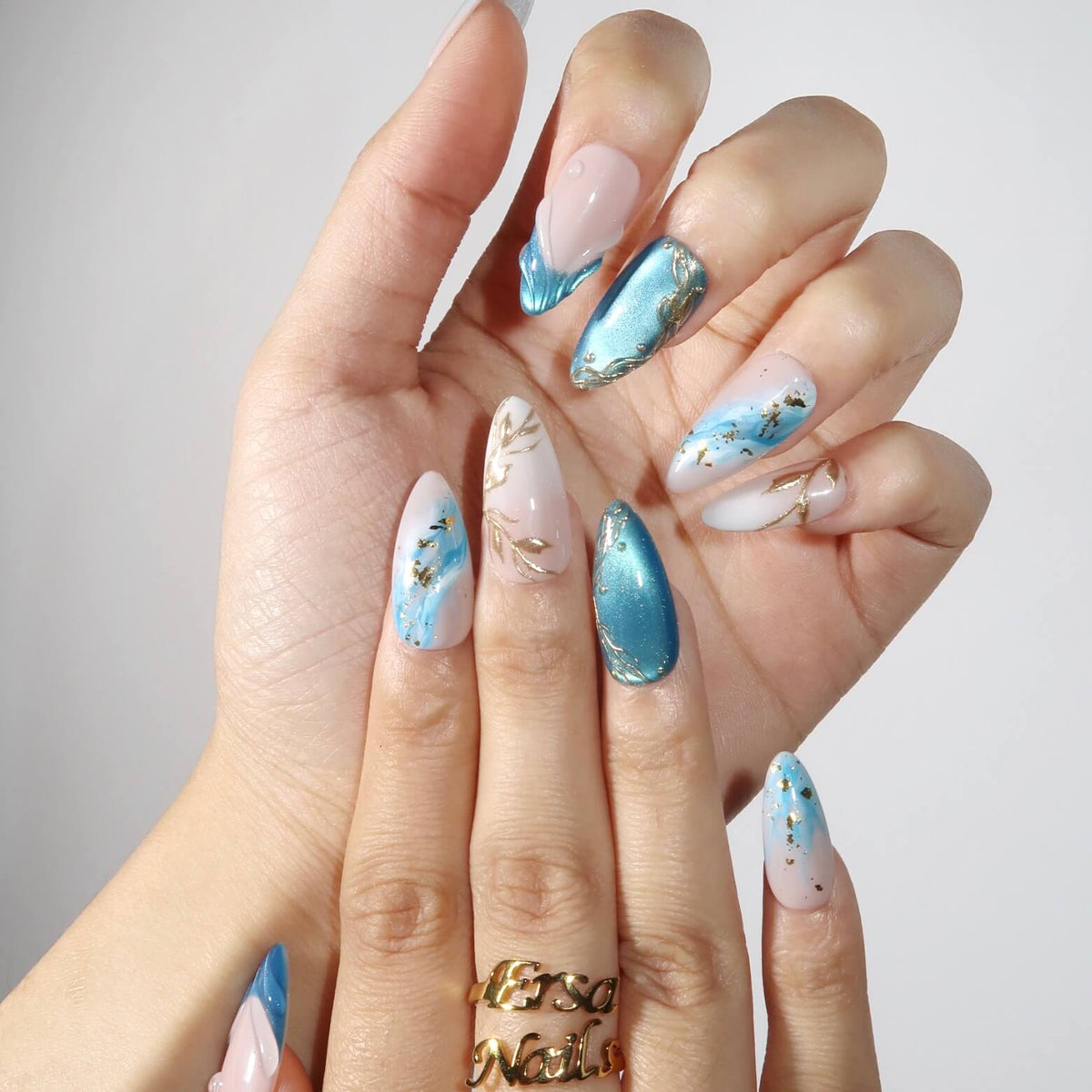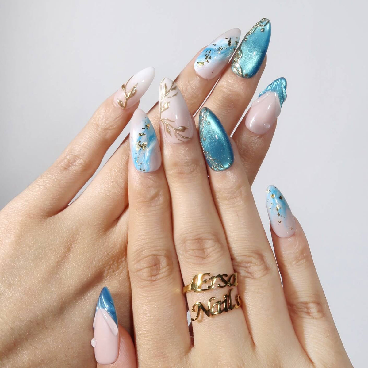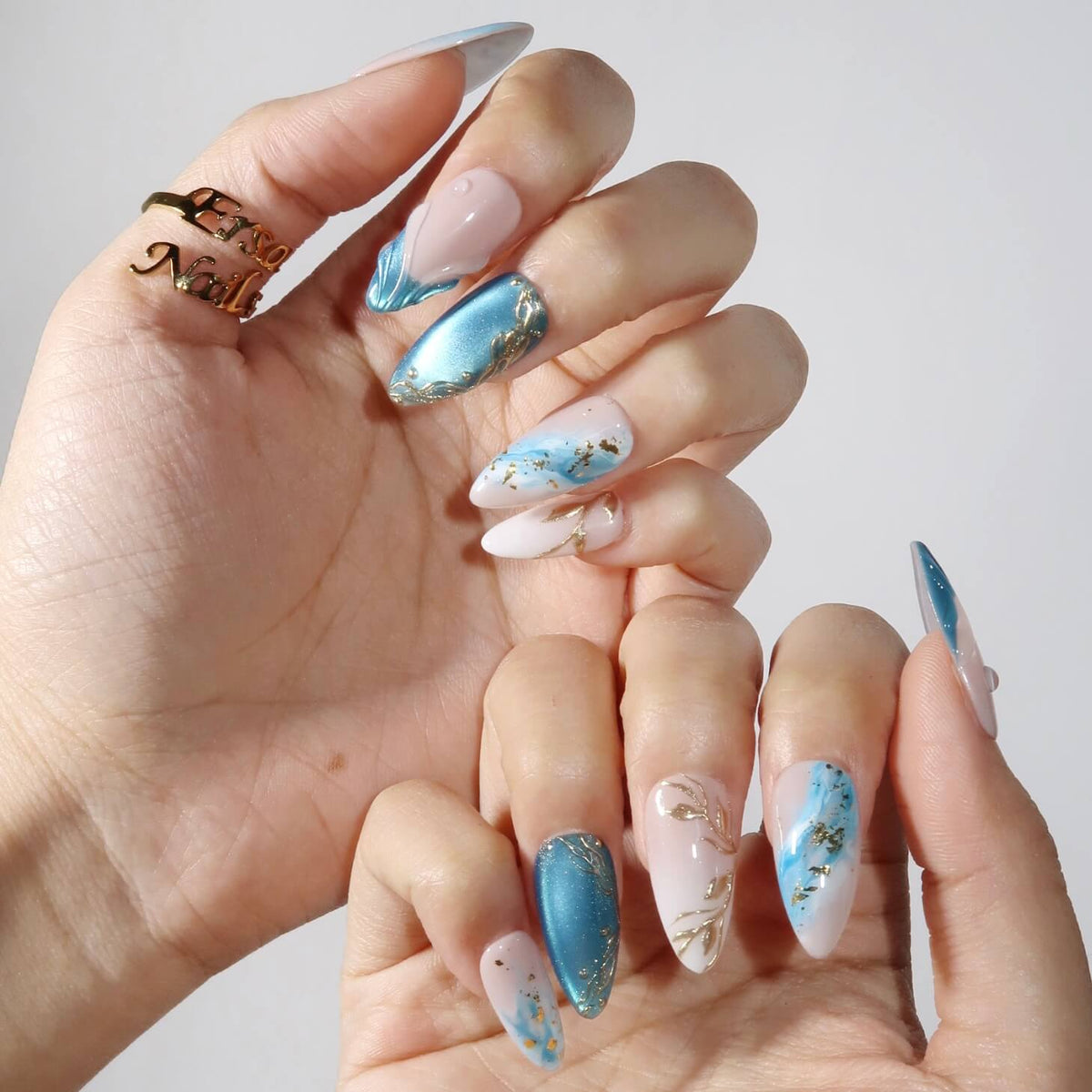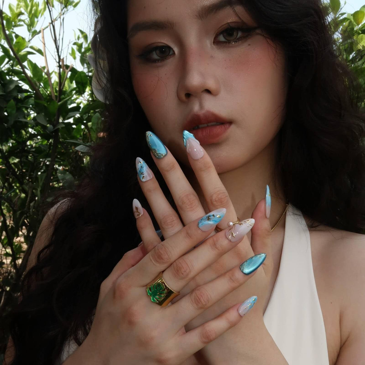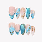 Dive into serenity with the Cool Water press-on nails from MituArt. With a nude base and captivating blue tones, these nails feature a mesmerizing blue cat-eye effect, creating a depth that's both calming and striking. The soft ombre design transitions seamlessly, while gold accents add a touch of elegance. Complete with a 3D mermaid design, Cool Water brings a fresh, aquatic vibe to your nails, perfect for adding a cool, sophisticated look to any occasion.