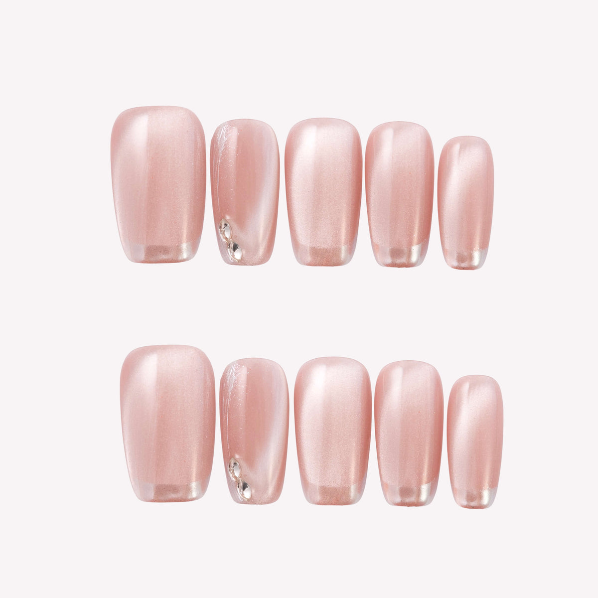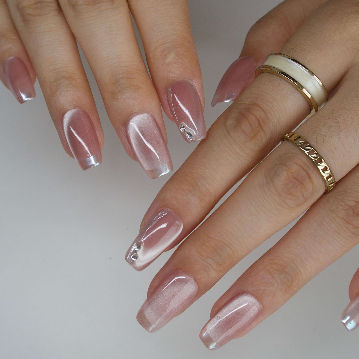 Experience the subtle magic of Fairydust from MituArt. These minimalist press-on nails showcase a pink cat-eye base paired with a sleek chrome French tip, accented by sparkling rhinestones for a touch of enchanting elegance.