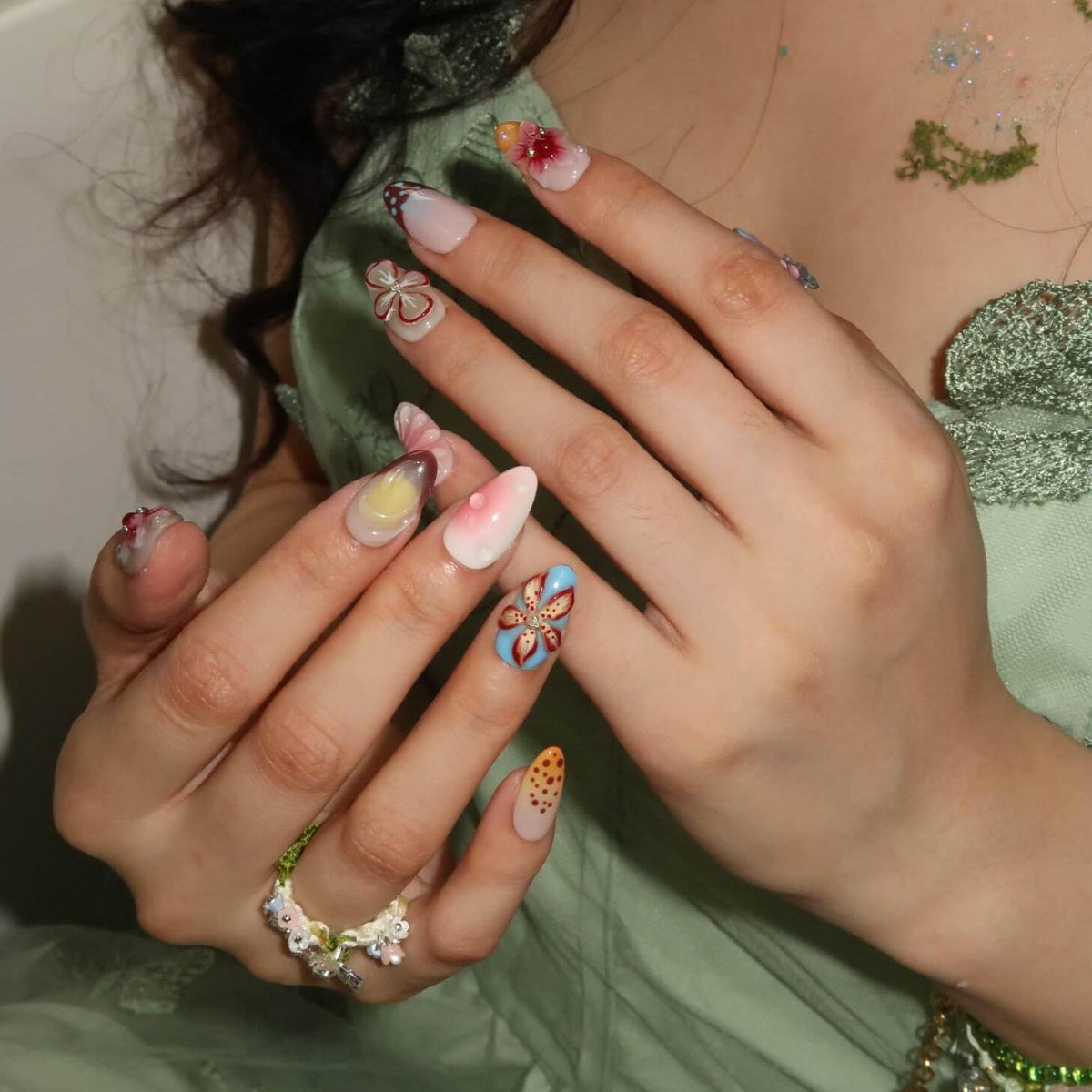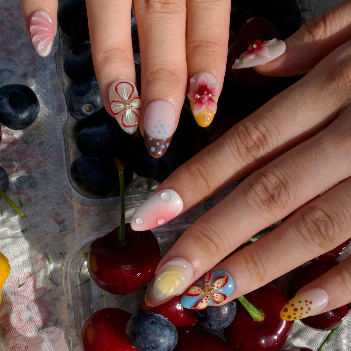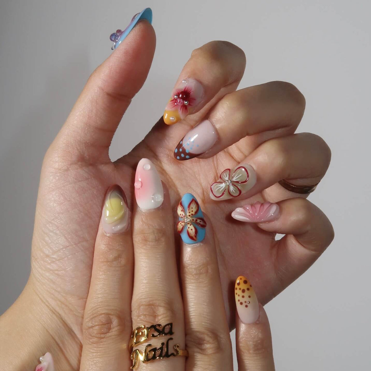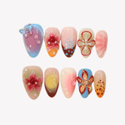 Unleash vibrant artistry with Kaleidoscope press-on nails from MituArt, blending bold blues, reds, yellows, and oranges with 3D florals, fluttering butterflies, and rippling water textures. Pearls add elegant contrast to the dynamic design, while the lightweight, durable fit ensures instant glamour—perfect for turning heads day or night. Effortless, eye-catching, and endlessly creative.