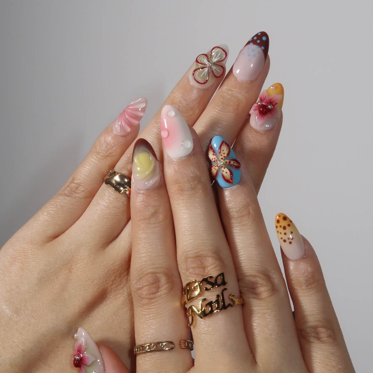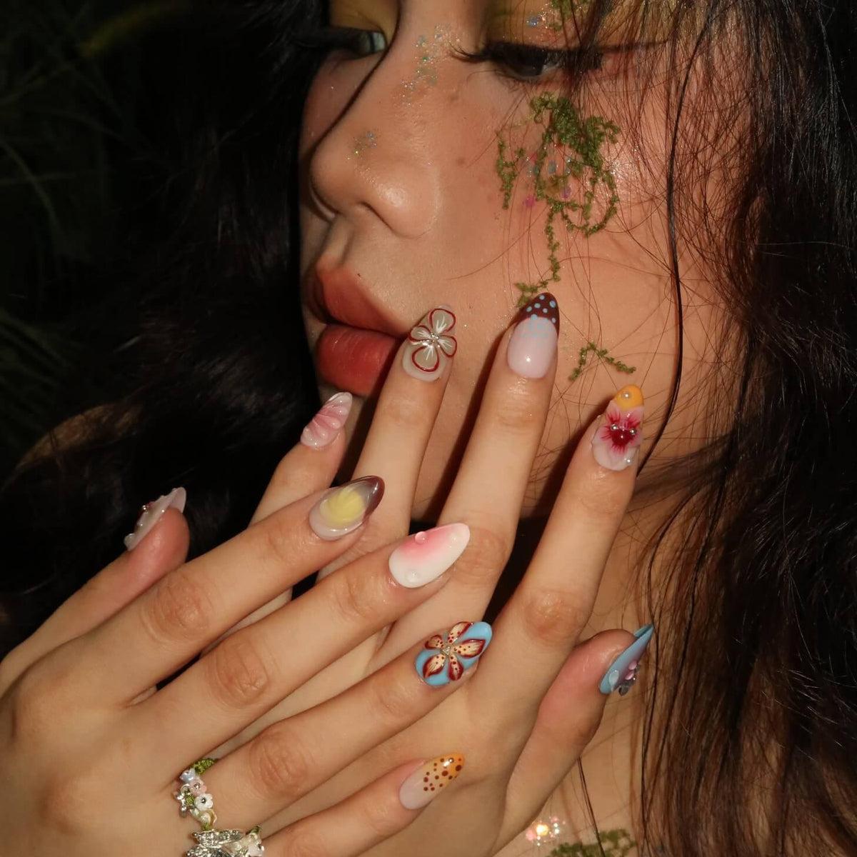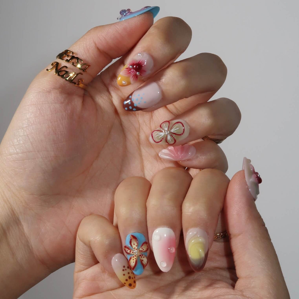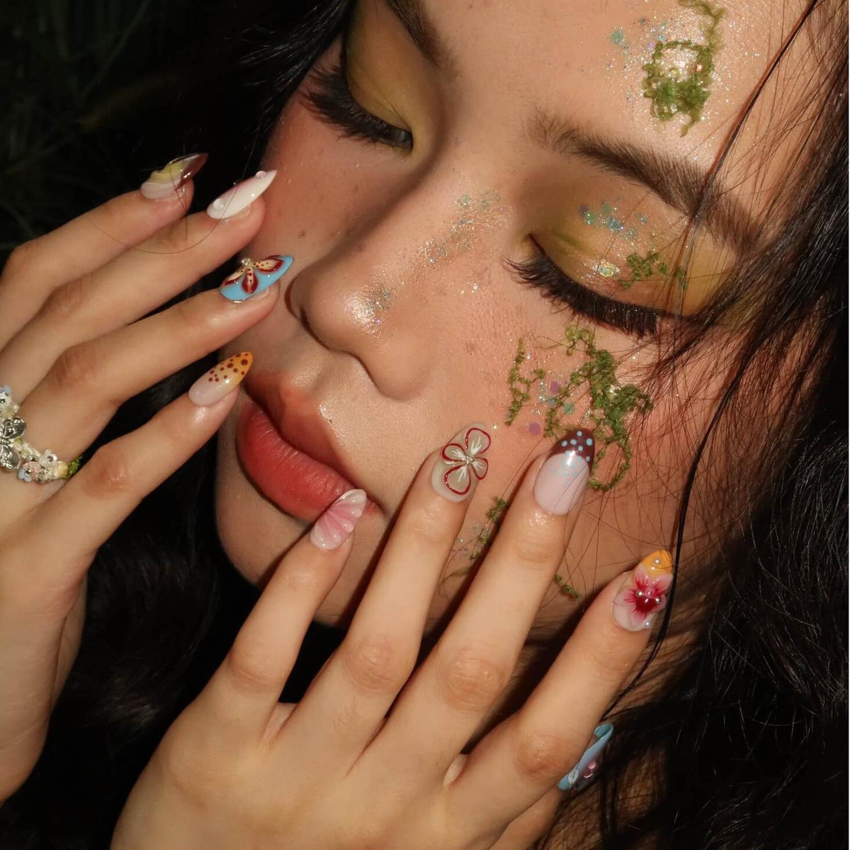 Unleash vibrant artistry with Kaleidoscope press-on nails from MituArt, blending bold blues, reds, yellows, and oranges with 3D florals, fluttering butterflies, and rippling water textures. Pearls add elegant contrast to the dynamic design, while the lightweight, durable fit ensures instant glamour—perfect for turning heads day or night. Effortless, eye-catching, and endlessly creative.