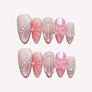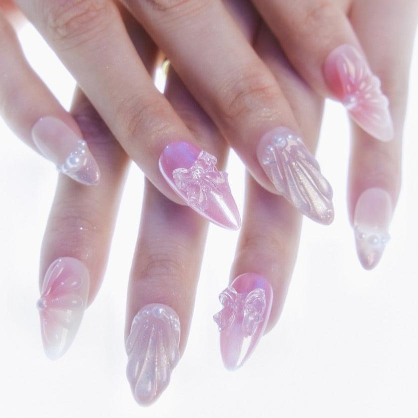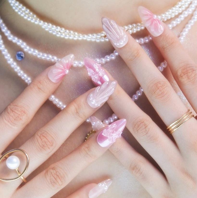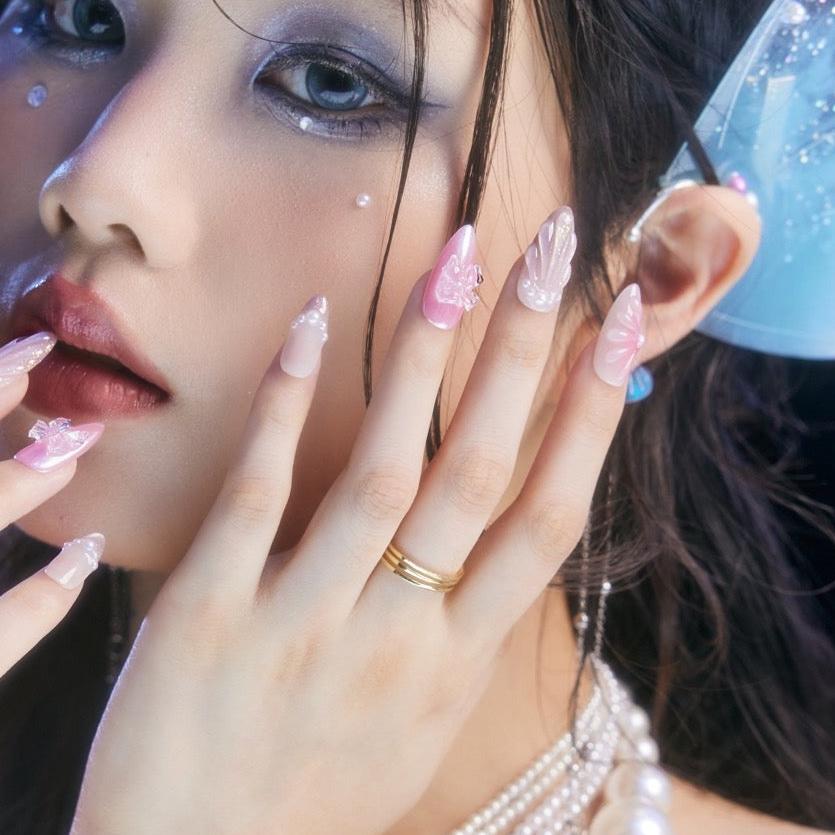 Embark on a journey of elegance with Miss Underwater by MituArt. These enchanting press-on nails feature a captivating gradient of pink cat-eye hues, reminiscent of the mesmerizing depths of the ocean. Delicately adorned with shimmering pearls and transparent butterfly accessories, each nail is a stunning work of art. The accent nail boasts a delicate water ripple design, adding a touch of aquatic charm to your fingertips. Dive into the allure of the sea with Miss Underwater—a perfect blend of sophistication and aquatic beauty.
