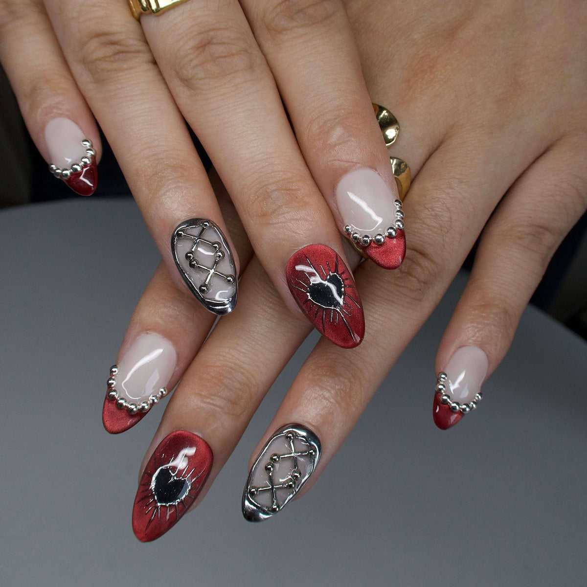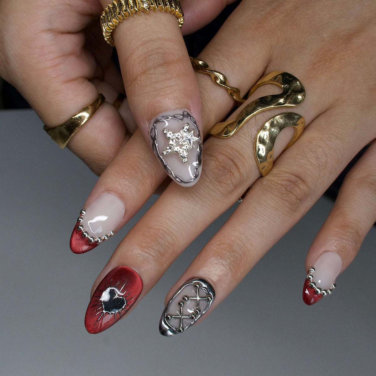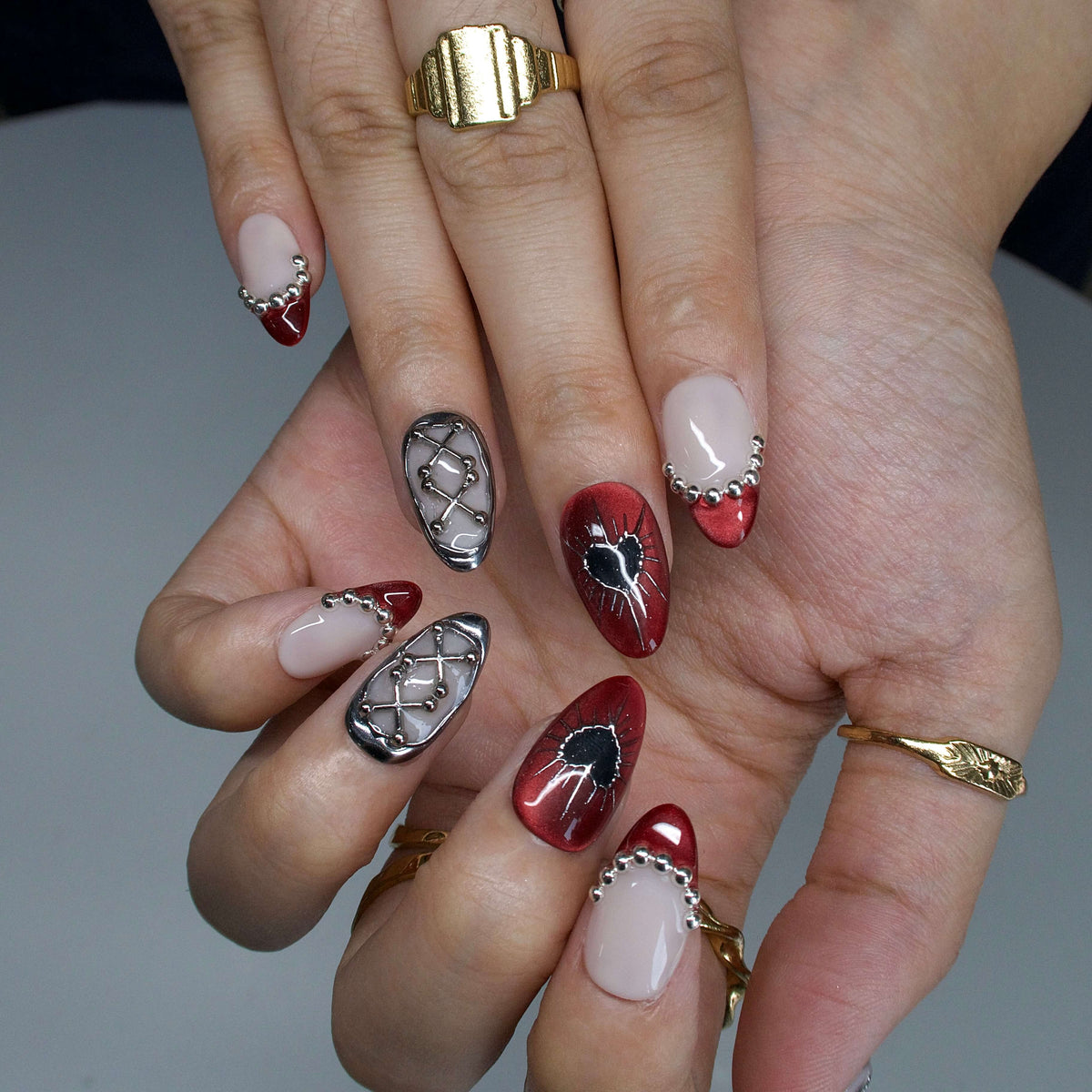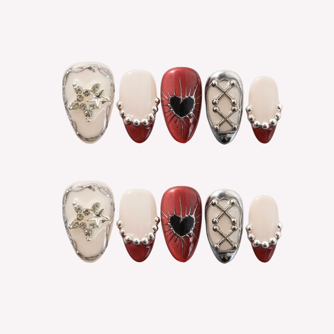 Rebel Heart by MituArt is a striking press - on nails design crafted to make a statement. Taking soft cream white and intense deep red as the core tones, it’s decorated with clusters of glistening star - shaped rhinestones, delicate silver bead trims, and eye - catching silver lattice patterns. The red - based nails even feature edgy black hearts with spiky silver outlines—ideal for adding a touch of bold charm to parties or daily looks that demand to stand out. NAIL SHAPE: Short Almond