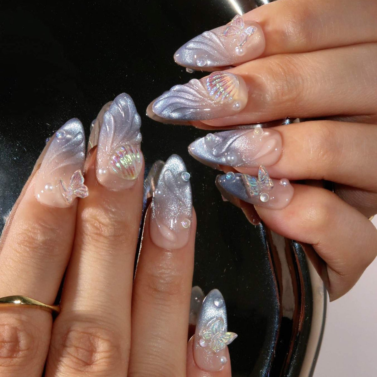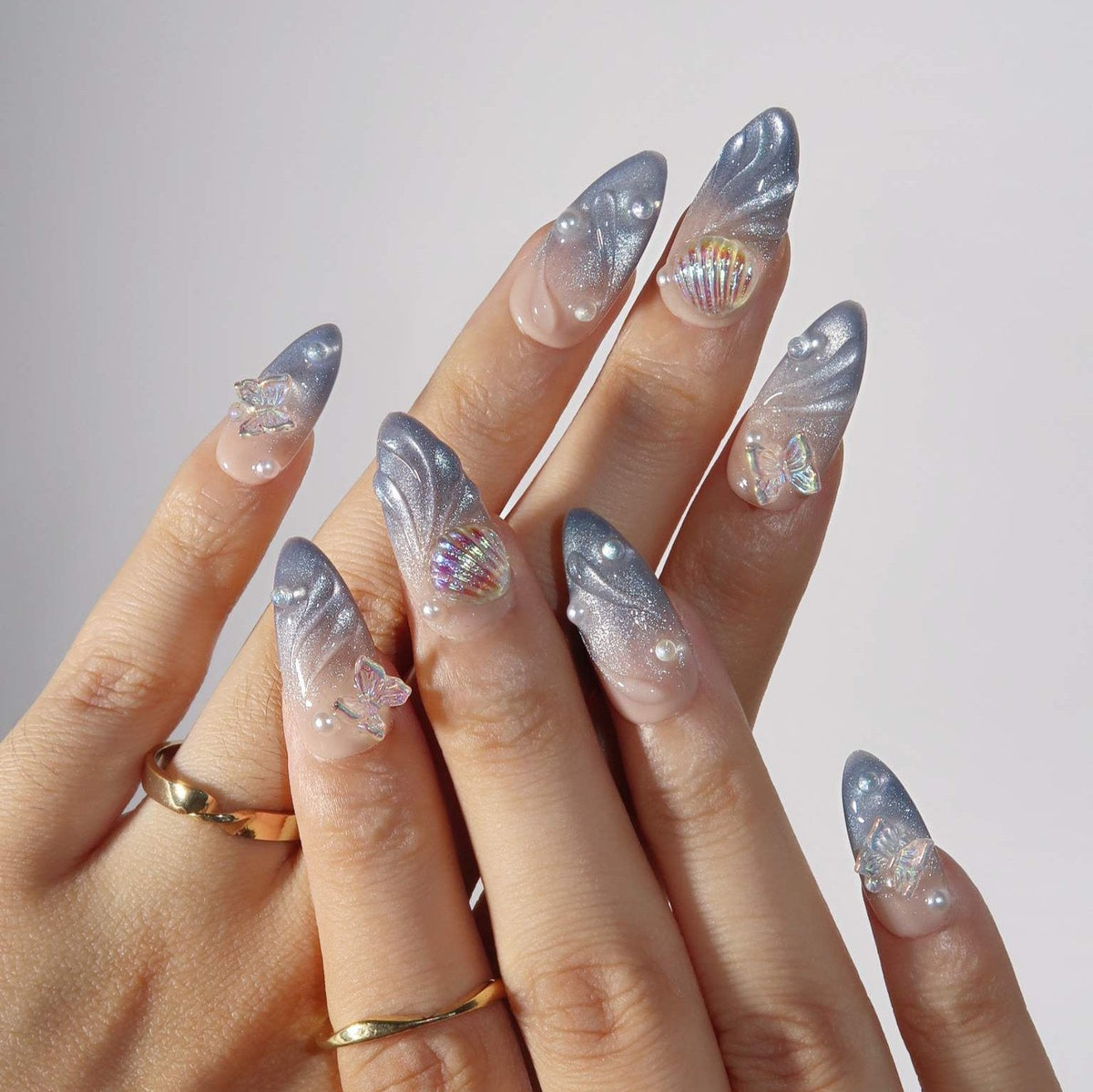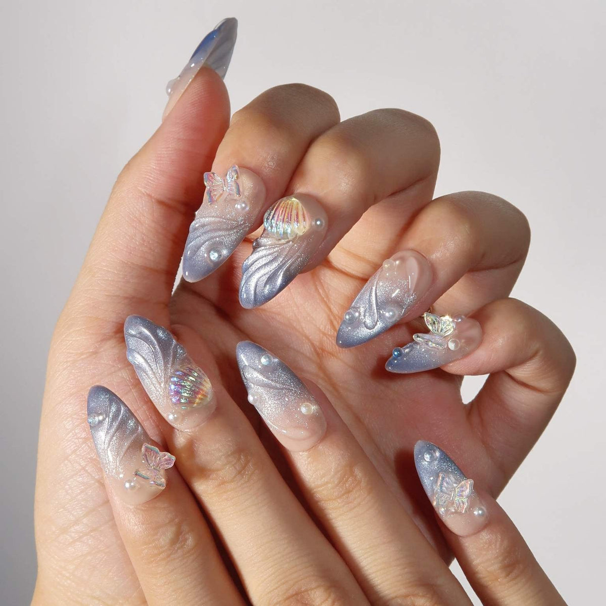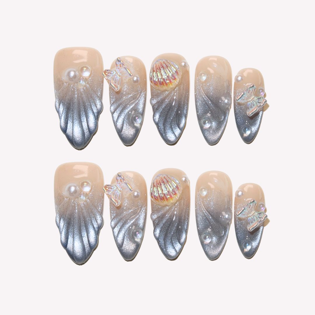 Transform your nails into a magical canvas with Starlit Fairytale Press-on Nails by MituArt. Featuring a captivating silver cat-eye gradient that shimmers like stars in the night sky, this design brings a sense of wonder to your fingertips. Adorned with delicate pearls, enchanting butterfly accents, and charming seashell embellishments, these nails evoke the beauty of a dreamlike fairytale. Perfect for those who love to add a touch of fantasy and elegance to their look, Starlit Fairytale captures the essence of a mystical and elegant night.