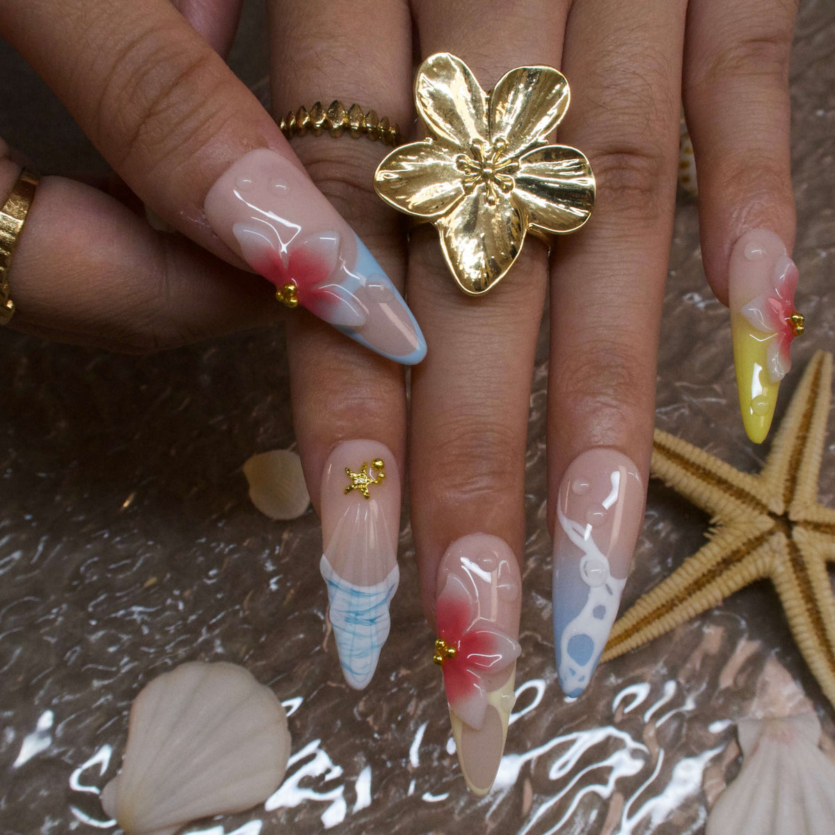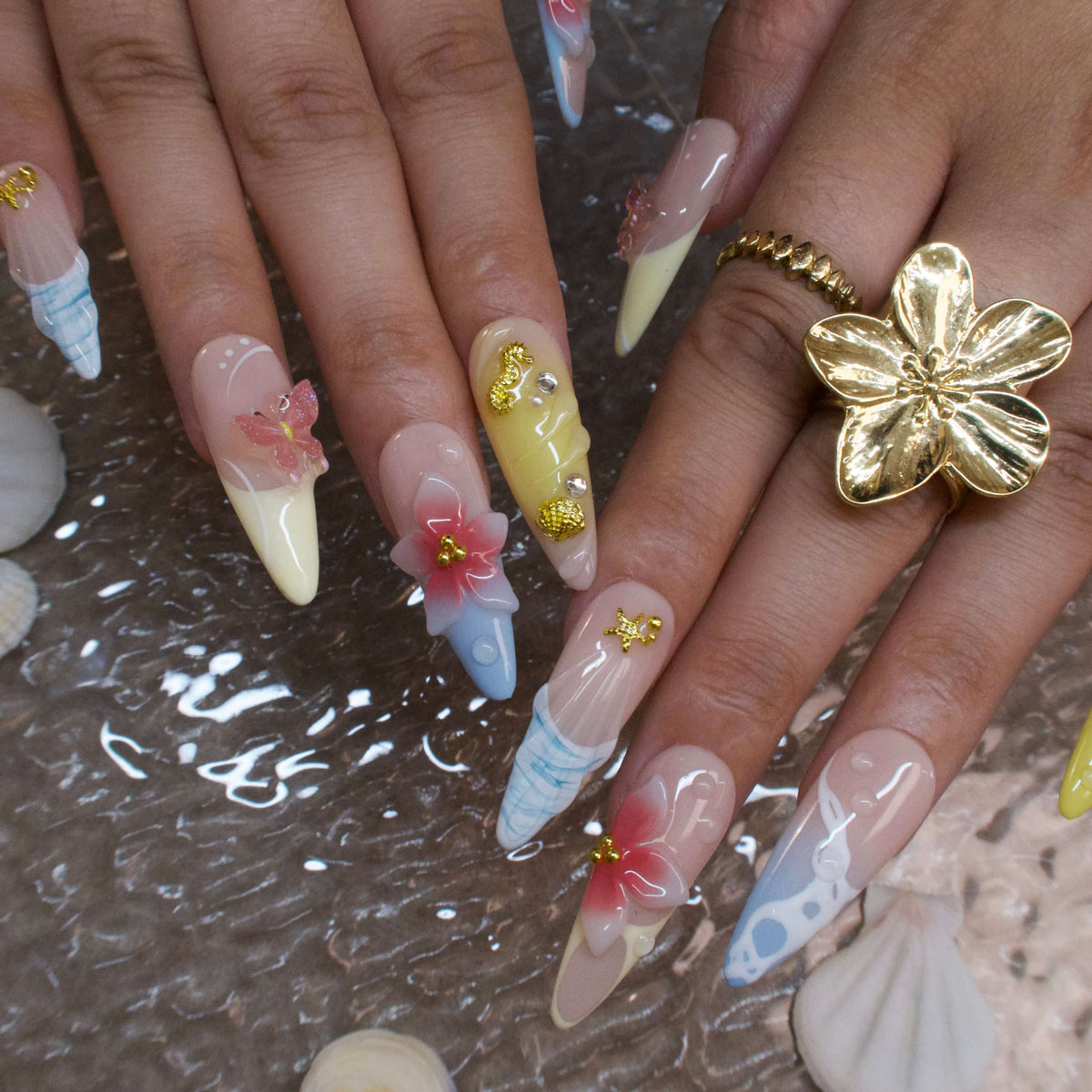 Bloomwave by MituArt transports you to a whimsical coastal escape. On a soft, peachy - pink base, delicate 3D flowers in blush pink bloom alongside tiny gold seahorses and starfish. Subtle gradients of sky blue and sunny yellow, plus dainty butterfly accents, mimic the carefree charm of a beachside stroll. Perfect for infusing festival looks or summer days with a touch of breezy, floral - filled seaside magic.